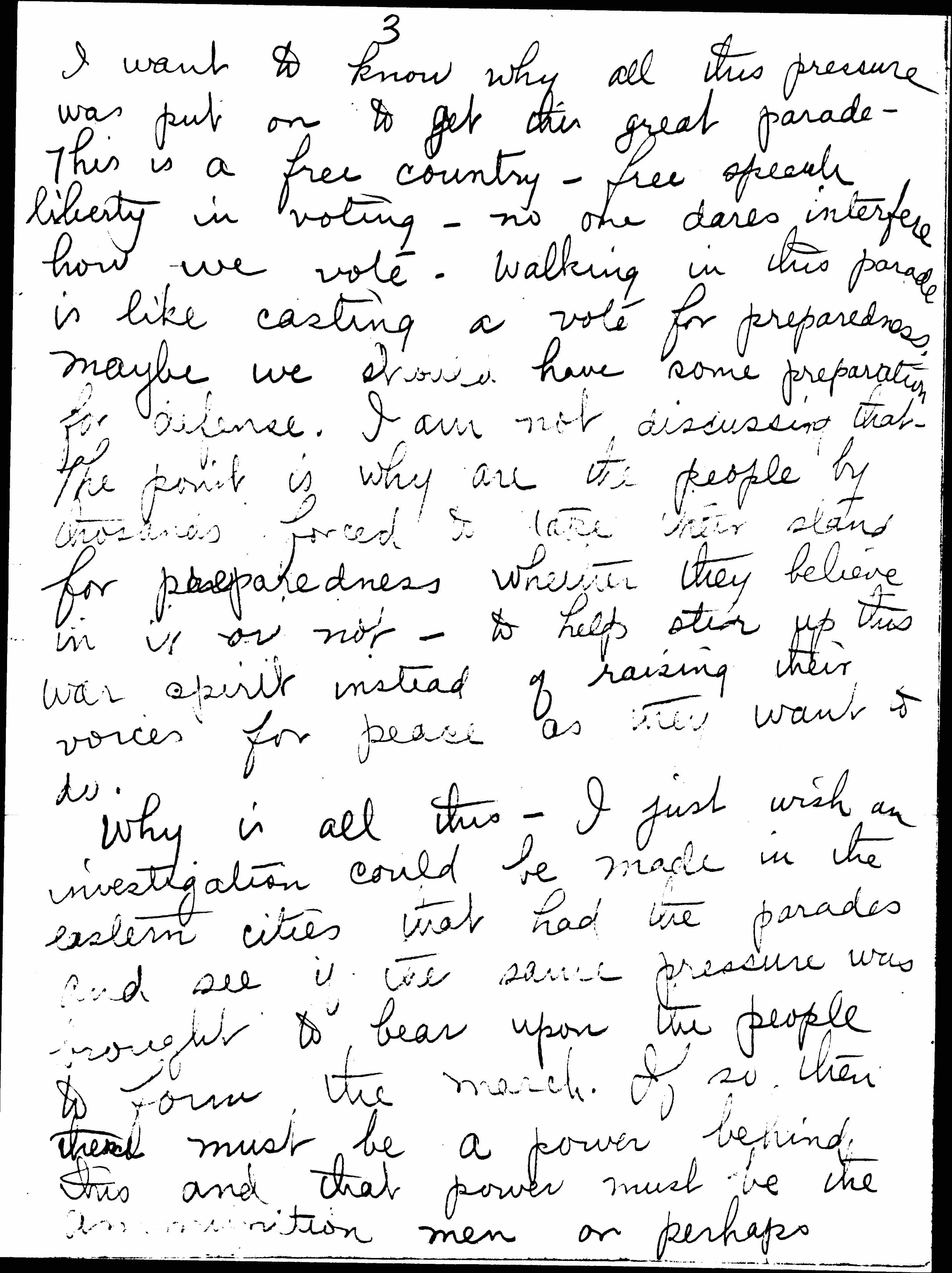 I want to know why all this pressure was put on to get this great parade. This is a free country -- free speech liberty in voting -- no one dares interfere how we vote. Walking in this parade is like casting a vote for preparedness, maybe we should have some preparation for defense. I am not discussing that. The point is why are the people by thousands forced to take their stand for preparedness whether they believe in it or not -- to help stir up this war spirit instead of raising their voices for peace as they want to do.