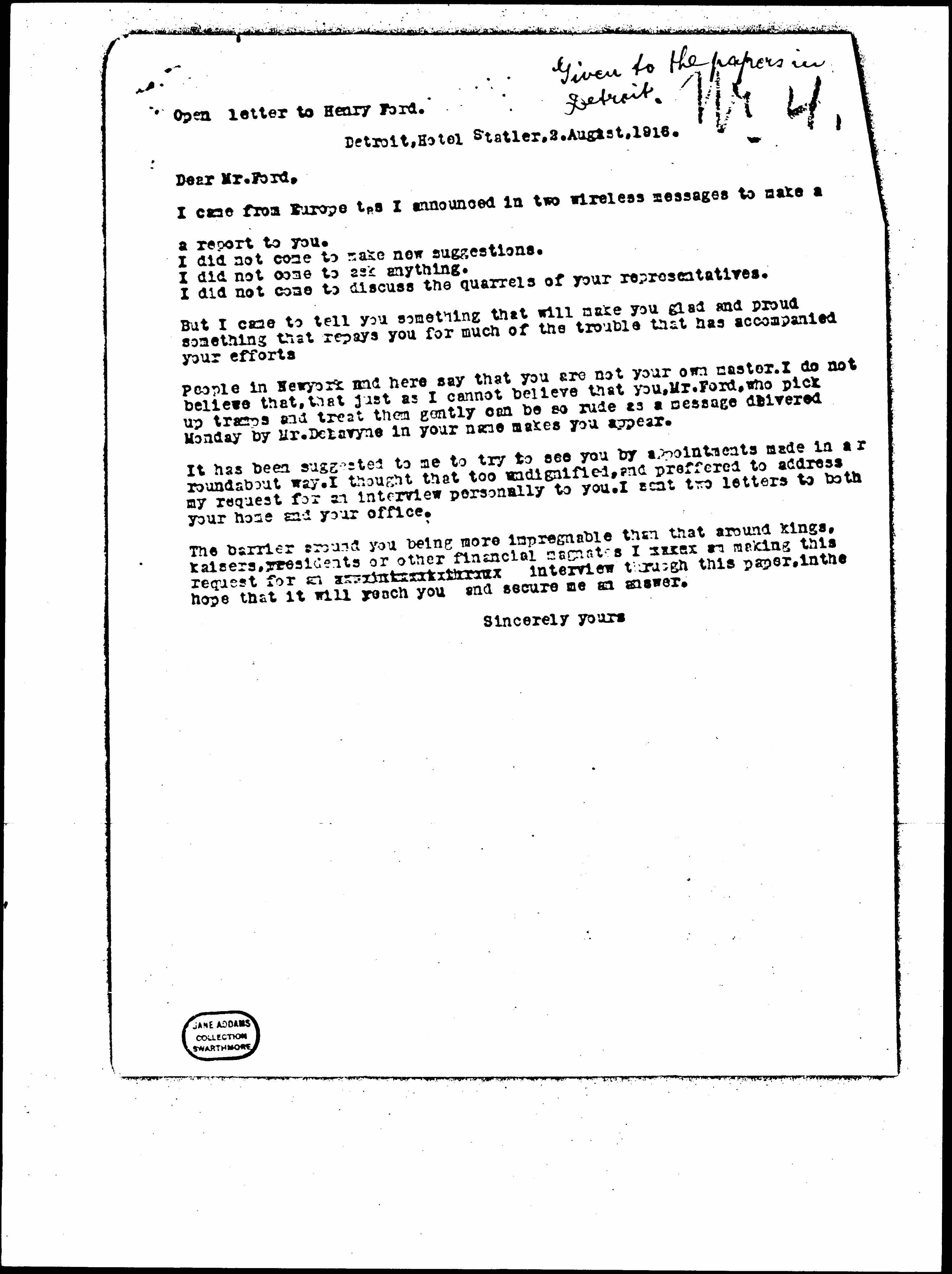 People in [New York] and here say that you are not your own master. I do not believe that, that just as I cannot believe that you, Mr. Ford, who pick up tramps and treat them gently can be so rude as a message [delivered] Monday by Mr. [Delavigne] in your name makes you appear.