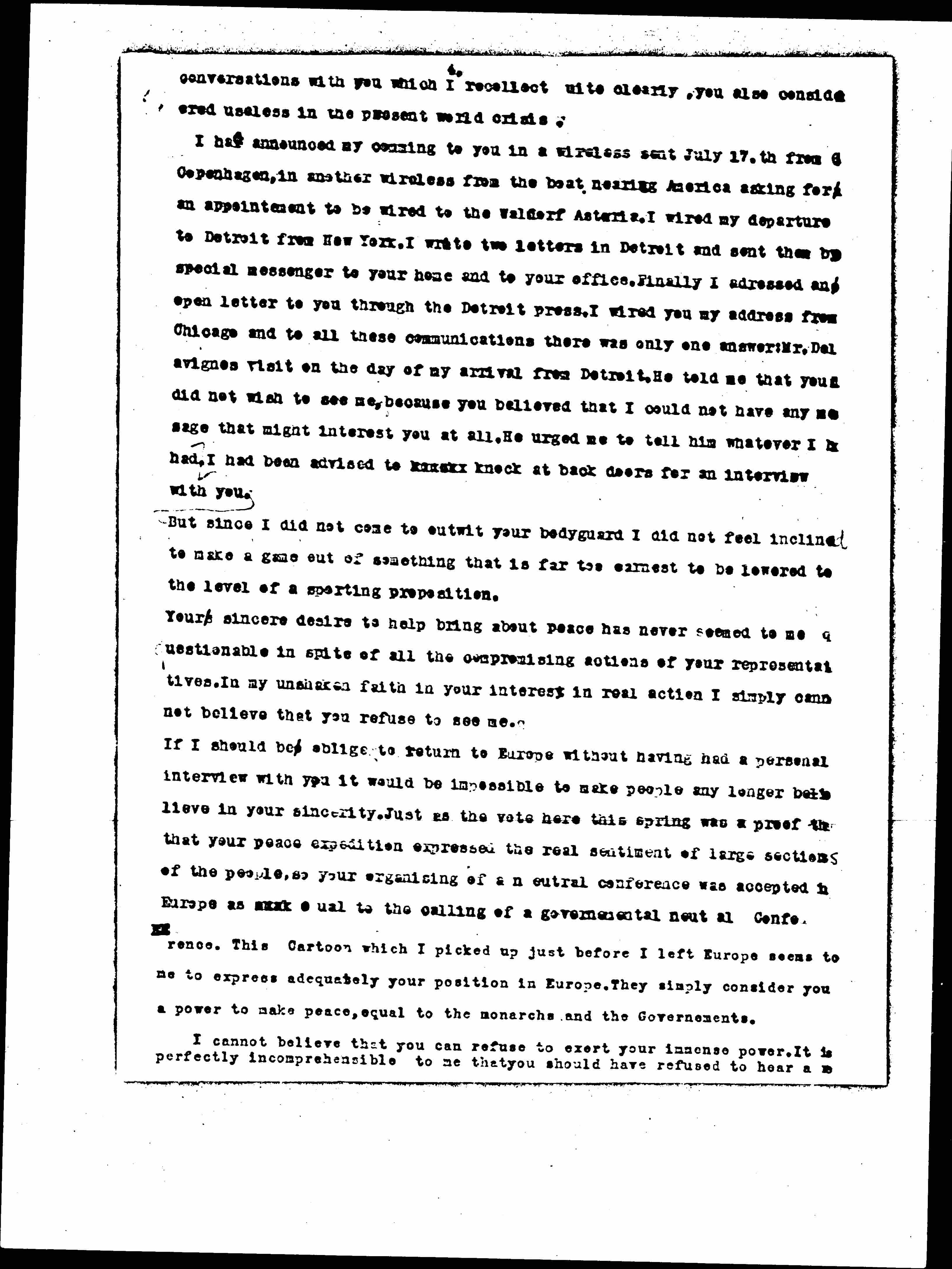 If I should be obliged to return to Europe without having had a personal interview with you it would be impossible to make people any longer believe in your sincerity. Just as the vote here this spring was a proof that your peace expedition expressed the real sentiment of large sections of the people, so your [organizing] of a neutral conference was accepted in Europe as [illegible] [equal?] to the calling of a [governmental] Neutral Conference. This Cartoon which I picked up just before I left Europe seems to me to express adequately your position in Europe. They simply consider you a power to make peace, equal to the monarchs and the [Governments].