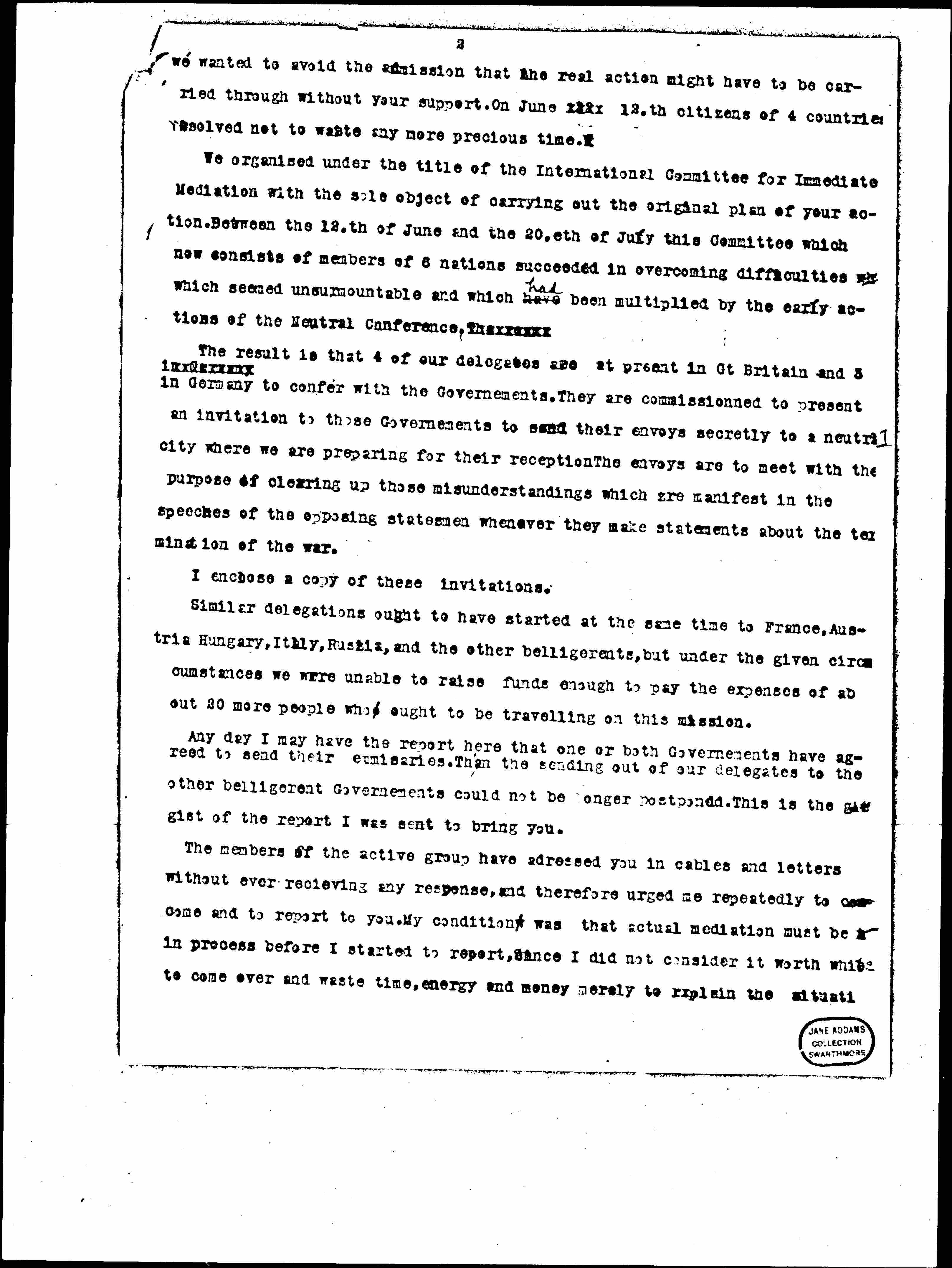 The members of the active group have [addressed] you in cables and letters without ever receiving any response, and therefore urged me repeatedly to come and to report to you. My condition was that actual mediation must be in process before I started to report, since I did not consider it worth while to come over and waste time, energy and money merely to explain the situation, [page 3] which it seems to us <had> never been fully presented to you. But I thought it proper and fair both to you and to the members of the International Committee for Immediate Mediation to report deeds for which you certainly must have been waiting all these long months.