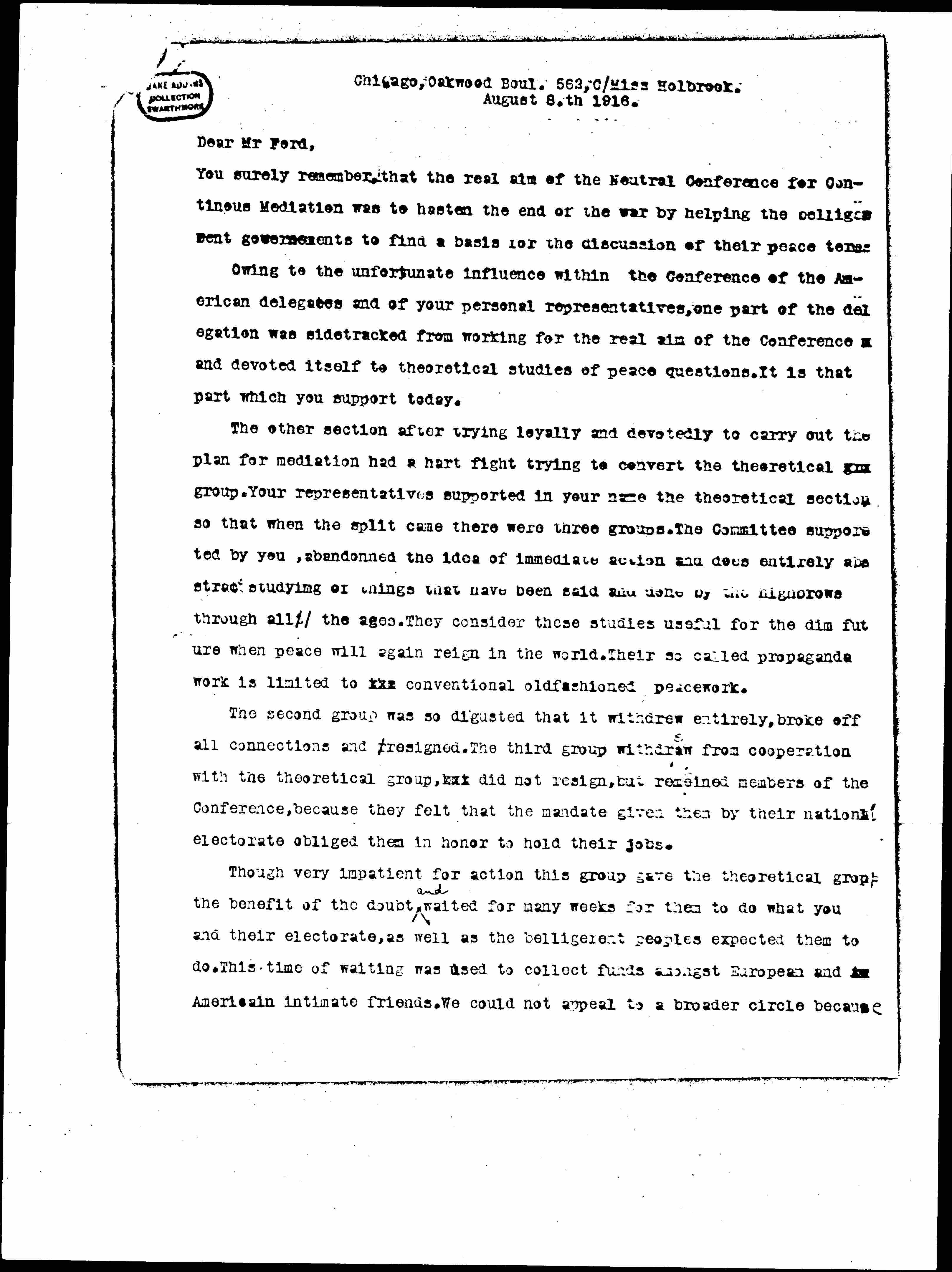 The other section after trying loyally and devotedly to carry out the plan for mediation had a [hard] fight trying to convert the theoretical group. Your representatives supported in your name the theoretical section so that when the split came there were three groups. The Committee [supported] by you [abandoned] the idea of immediate action and does entirely abstract studying of things that have been said and done by the highbrows through all the ages. They consider these studies useful for the dim future when peace will again reign in the world. Their so called propaganda work is limited to [illegible] conventional old fashioned peace work.