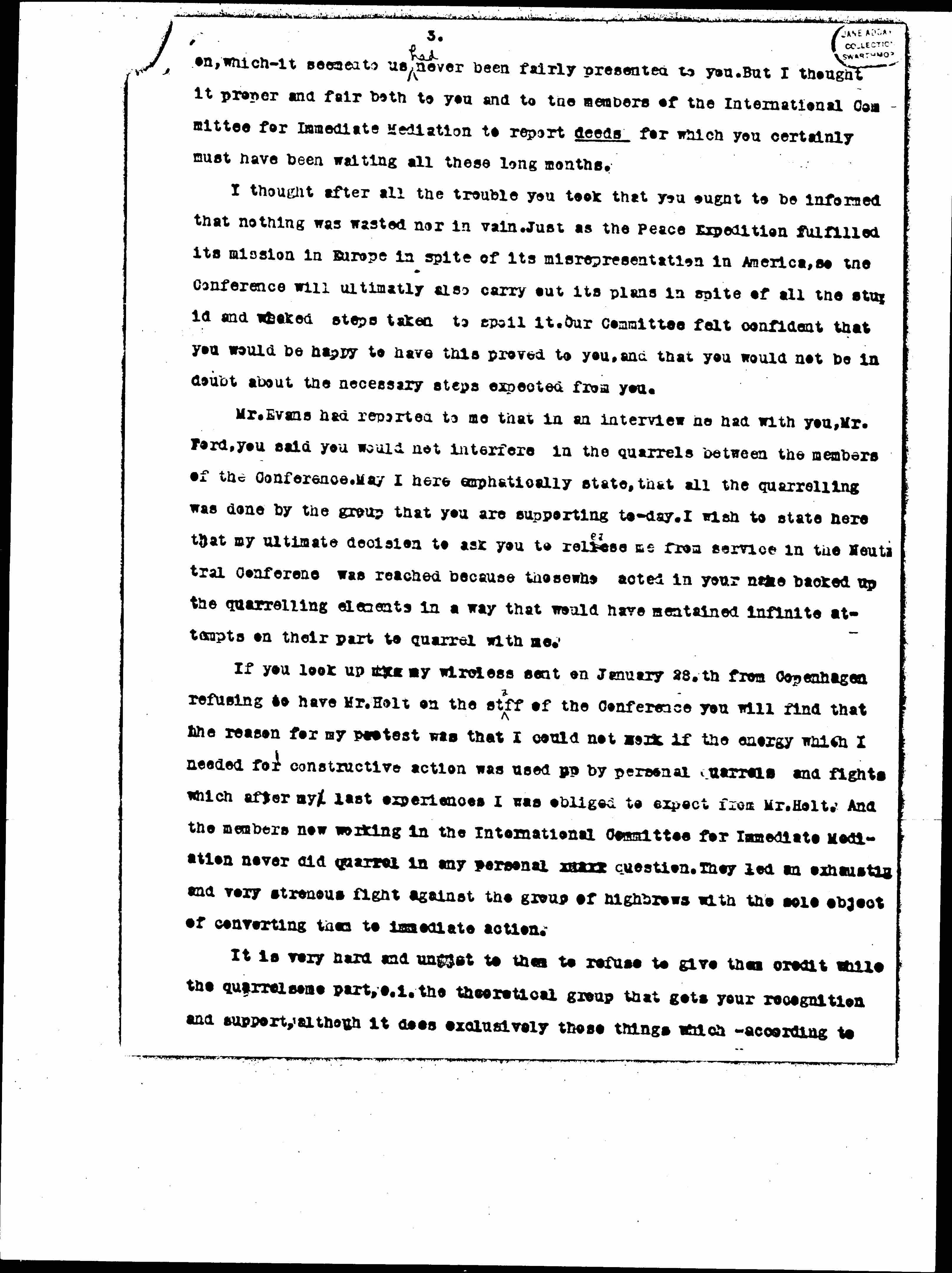 If you look up [illegible] my wireless sent on January [28th] from Copenhagen refusing to have Mr. Holt on the staff of the Conference you will find that the reason for my protest was that I could not work if the energy which I needed for constructive action was used up by personal quarrels and fights which after my last experiences I was obliged to expect from Mr. Holt. And the members now working in the International Committee for Immediate Mediation never did quarrel in any personal [illegible] question. They led an [exhausting] and very strenuous fight against the group of highbrows with the sole object of converting them to immediate action.