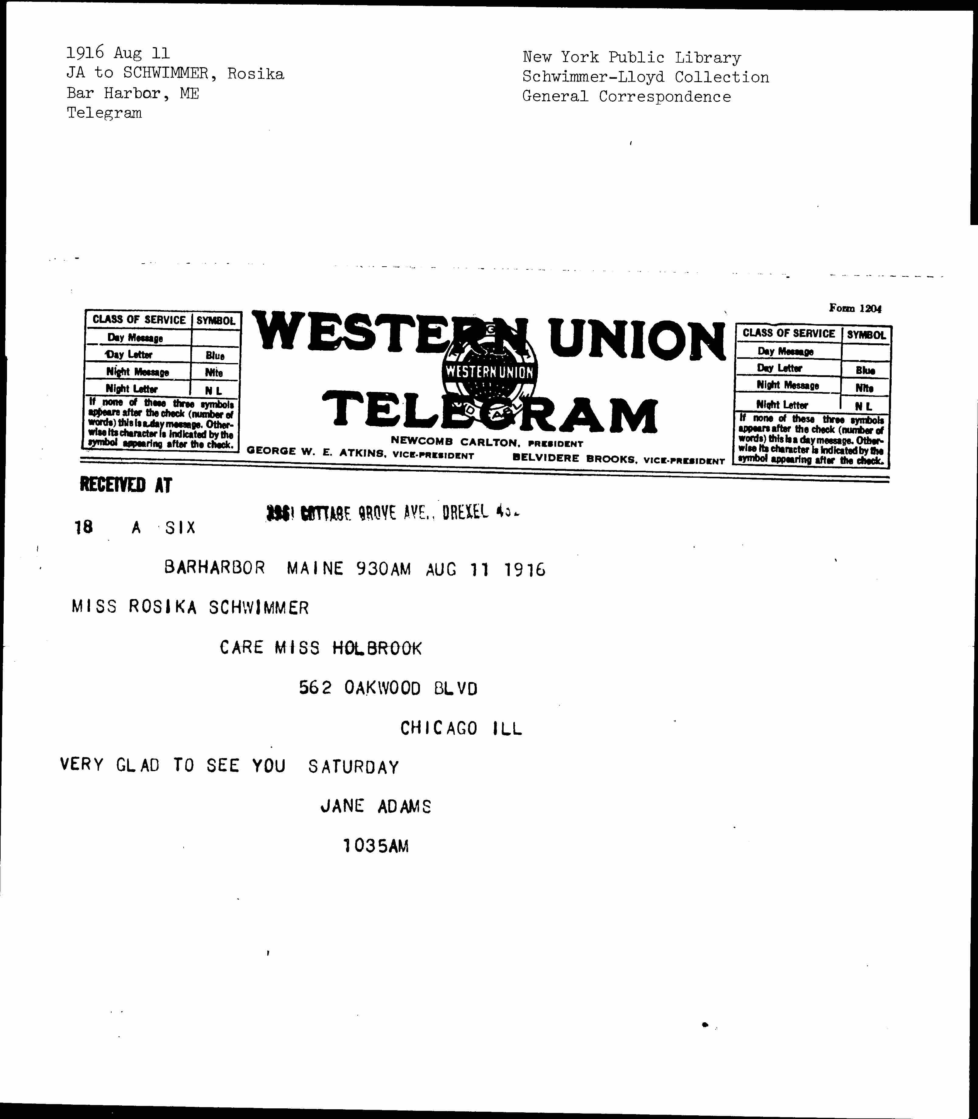 RECEIVED AT [2361?] COTTAGE GROVE AVE. [STAMPED]