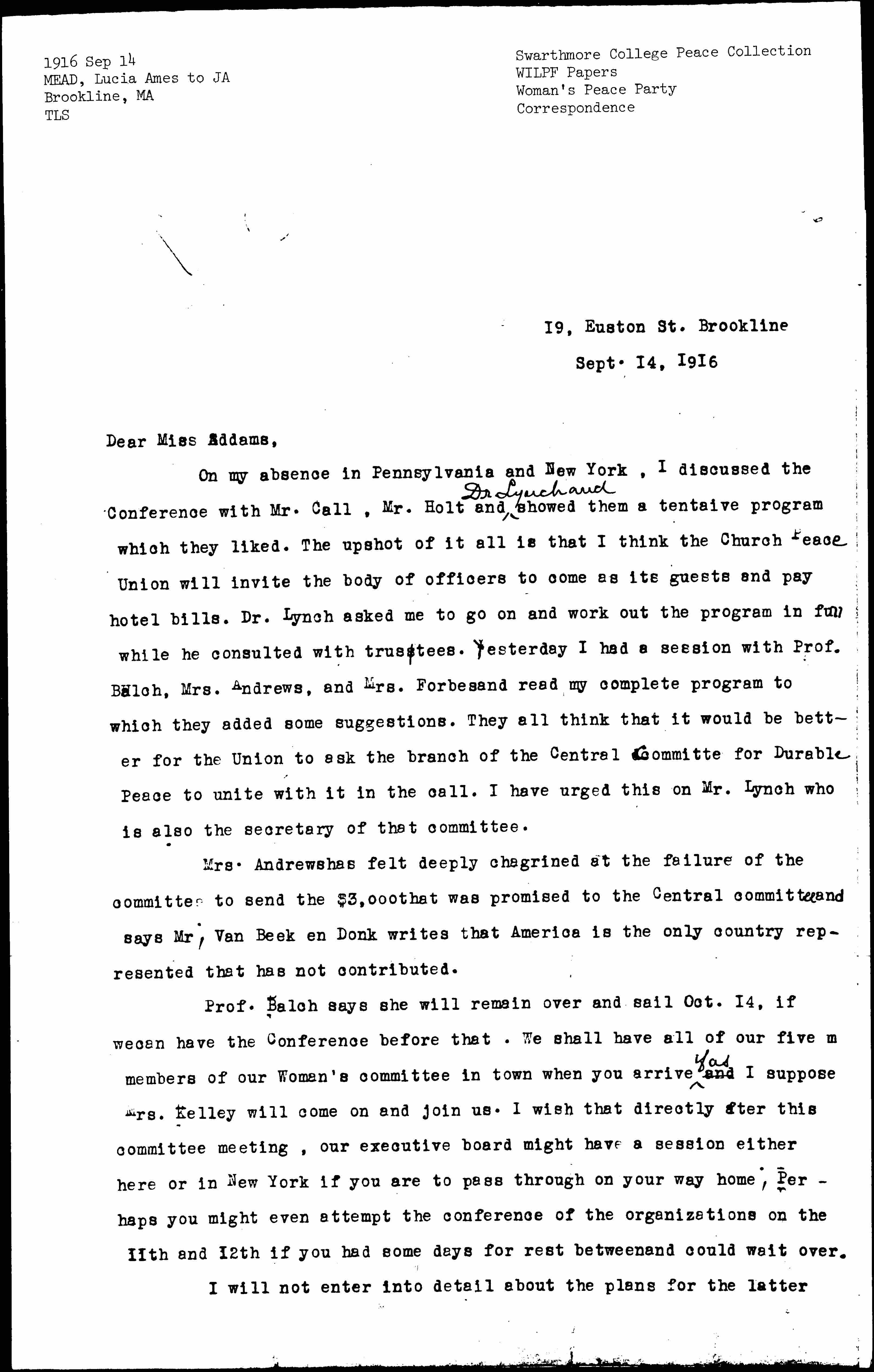 On my absence in Pennsylvania and New York, I discussed the Conference with Mr. Call, Mr. Holt and <Dr Lynch and> showed them a [tentative] program which they liked. The upshot of it all is that I think the Church Peace Union will invite the body of officers to come as its guests and pay hotel bills. Dr. Lynch asked me to go on and work out the program in full while he consulted with trustees. Yesterday I had a session with Prof. Balch, Mrs. Andrews, and Mrs. Forbes and read my complete program to which they added some suggestions. They all think that it would be better for the Union to ask the branch of the Central [Committee] for Durable Peace to unite with it in the call. I have urged this on Mr. Lynch who is also the secretary of that committee.
