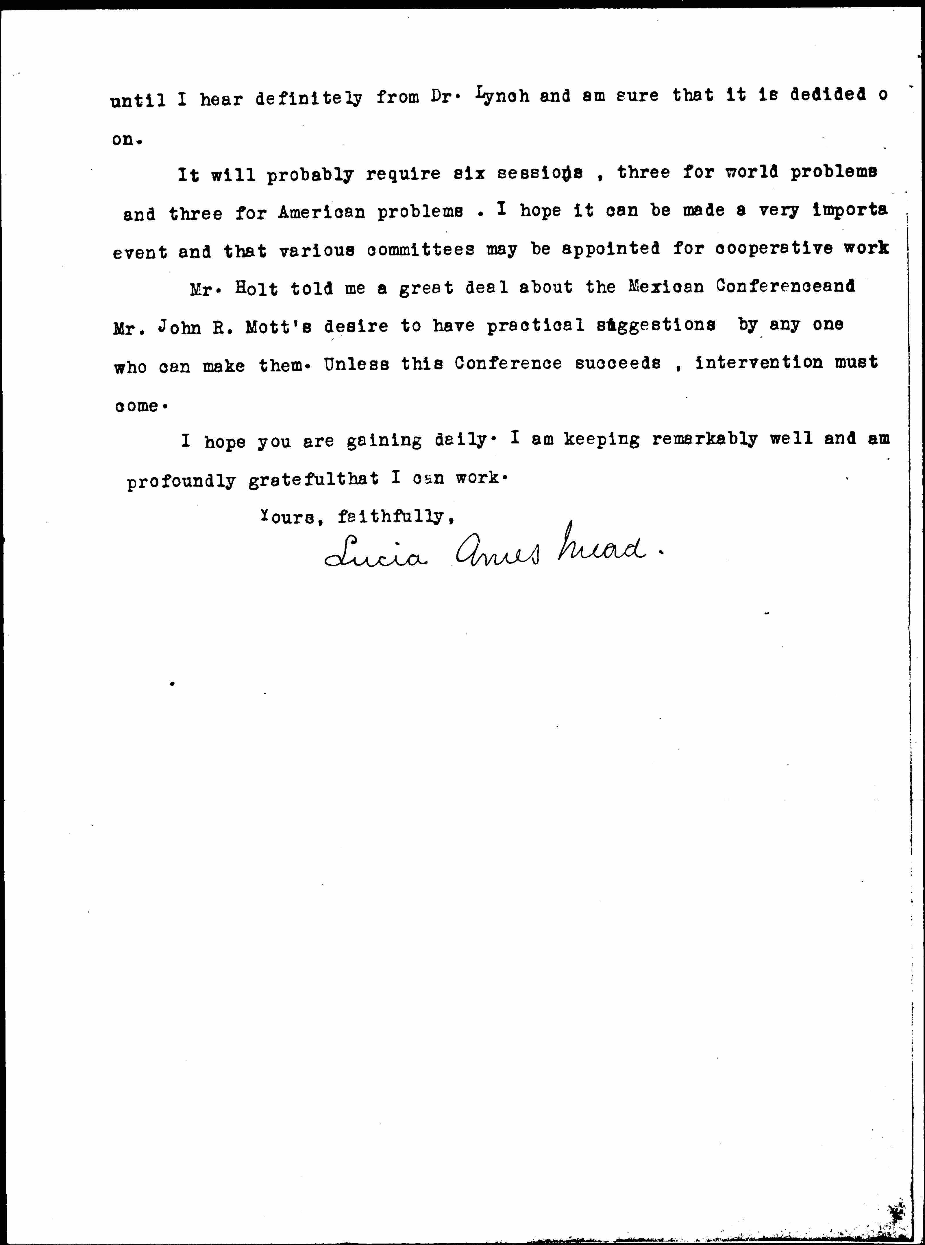 Mr. Holt told me a great deal about the Mexican Conference and Mr. John R. Mott's desire to have practical suggestions by any one who can make them. Unless this Conference succeeds, intervention must come.