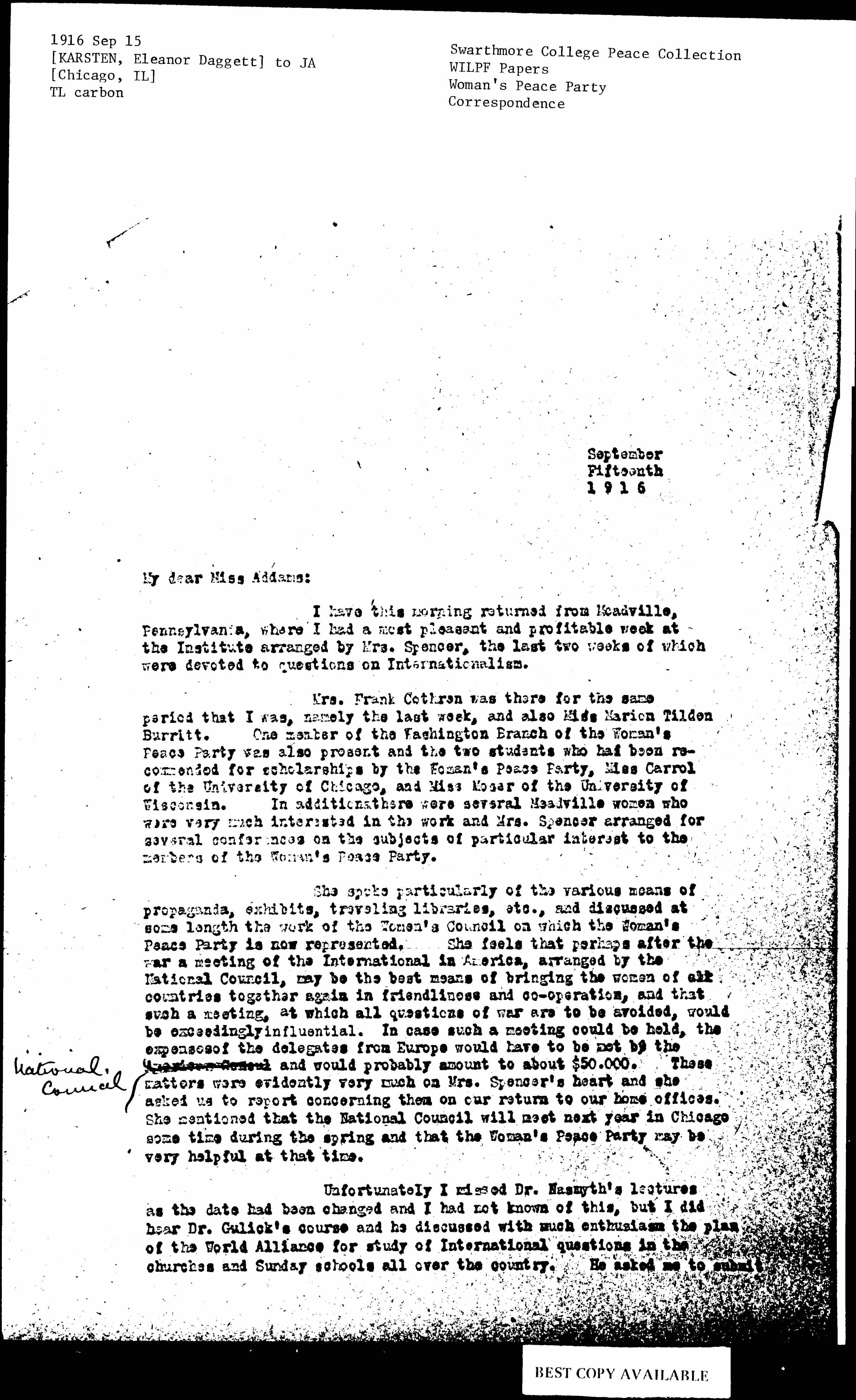 She spoke particularly of the various means of propaganda, exhibits, traveling libraries, etc., and discussed at some length the work of the Women's Council on which the Woman's Peace Party is now represented. She feels that perhaps after the war a meeting of the International in America, arranged by the National Council, may be the best means of bringing the women of all countries together again in friendliness and [cooperation], and that such a meeting, at which all questions of war are to be avoided, would be exceedingly influential. In case such a meeting could be held, the expenses of the delegates from Europe would have to be met by the American Consul <National Council> and would probably amount to about $50.000. These matters were evidently very much on Mrs. Spencer's heart and she asked us to report concerning them on our return to our home offices. She mentioned that the National Council will meet next year in Chicago some time during the spring and that the Woman's Peace Party may be very helpful at that time.