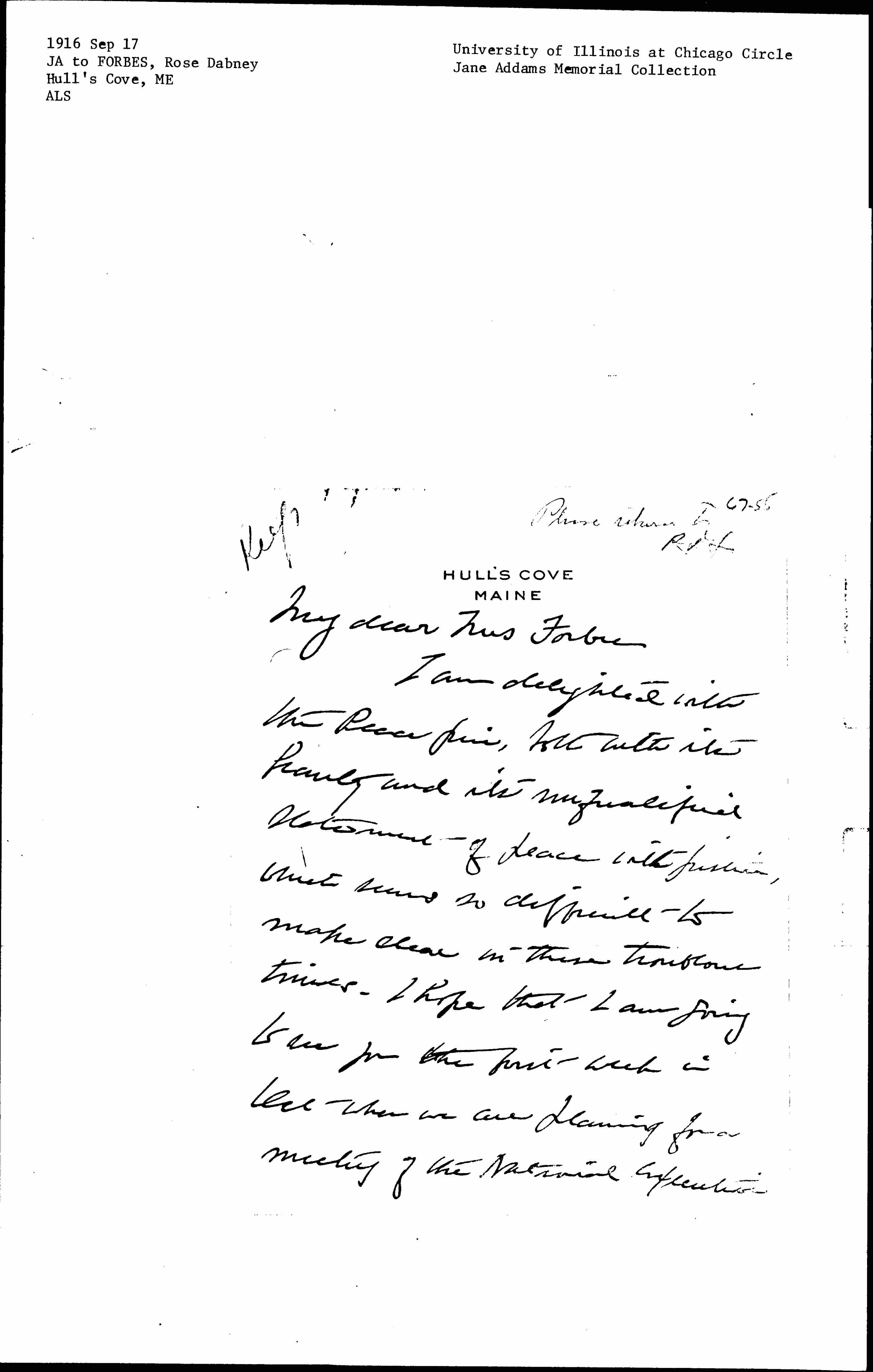 I am delighted with the Peace pin, both with its beauty and its unqualified statement of peace with justice, which seems so difficult to make clear in these troublous times. I hope that I am going to see you the first week in Oct when we are planning for a meeting of the National Executive [page 2] Committee in Boston.