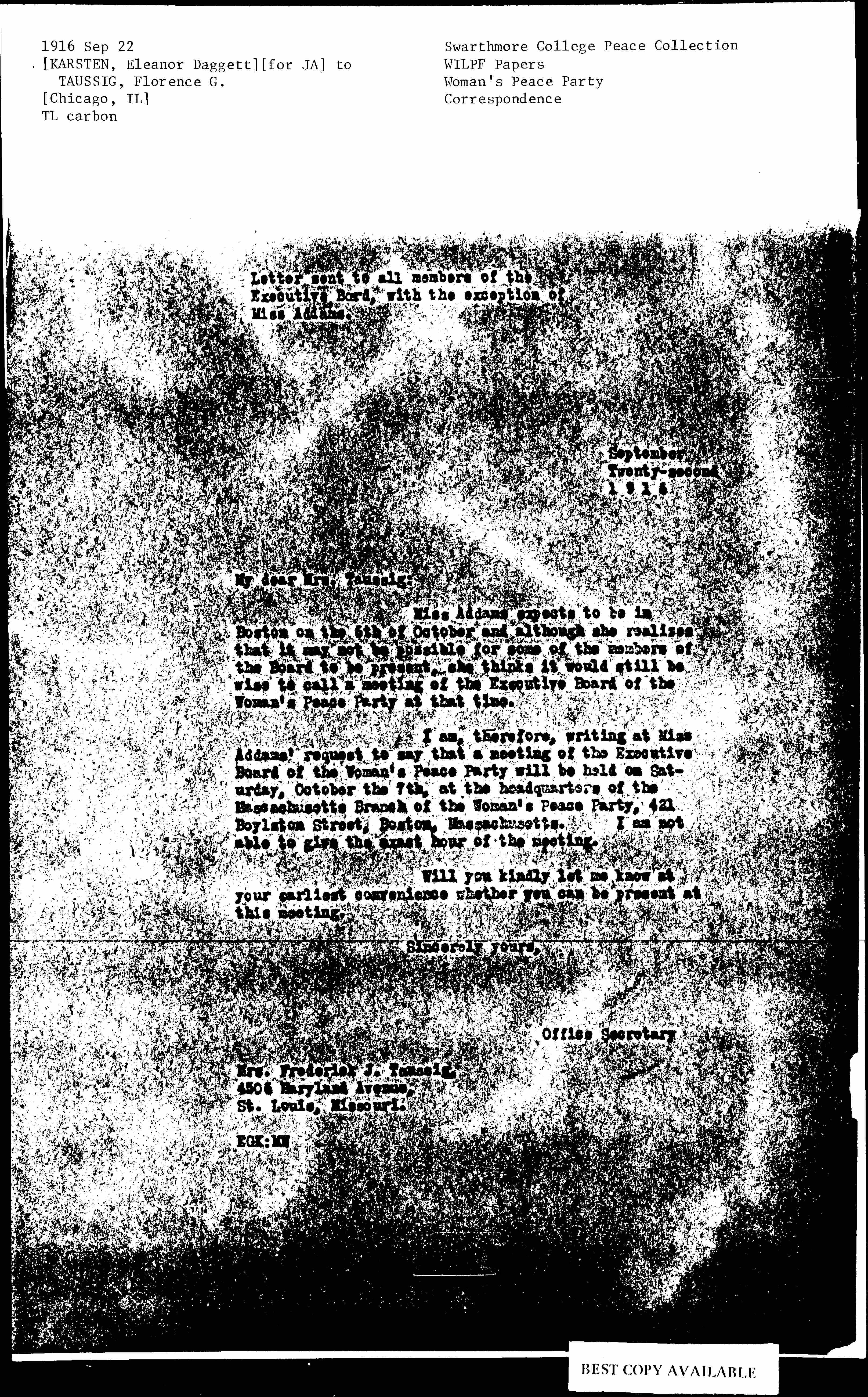 I am, therefore, writing at Miss Addams' request to say that a meeting of the Executive Board of the Woman's Peace Party will be held on Saturday, October the 7th, at the headquarters of the Massachusetts Branch of the Woman's Peace Party, 421 Boylston Street, Boston, Massachusetts. I am not able to give the exact hour of the meeting.
