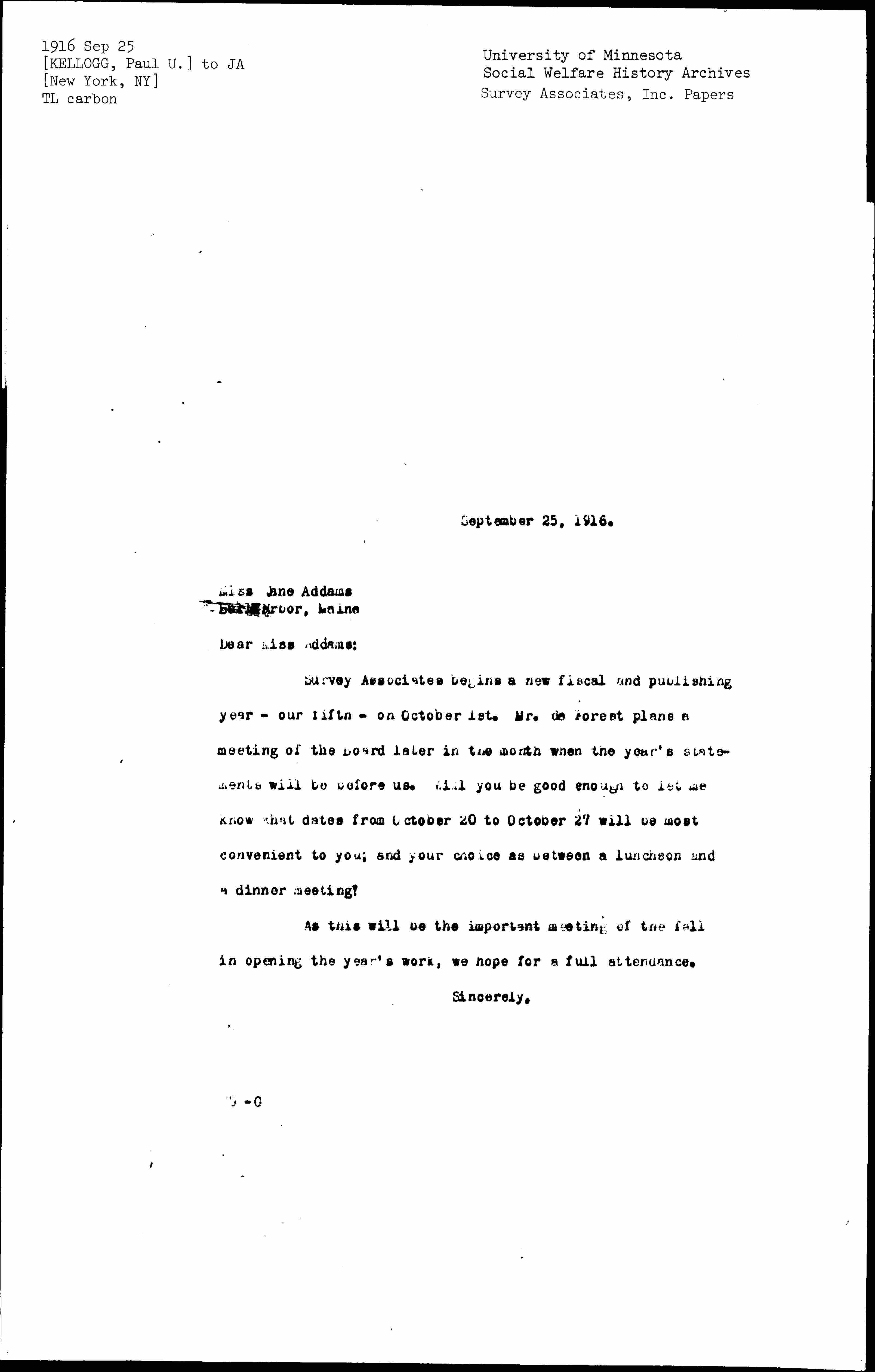 Survey Associates begins a new fiscal and publishing year -- our fifth -- on October 1st. Mr. DeForest plans a meeting of the Board later in the month when the year's statements will be before us. Will you be good enough to let me know what dates from October 20 to October 27 will be most convenient to you; and your choice as between a luncheon and a dinner meeting?