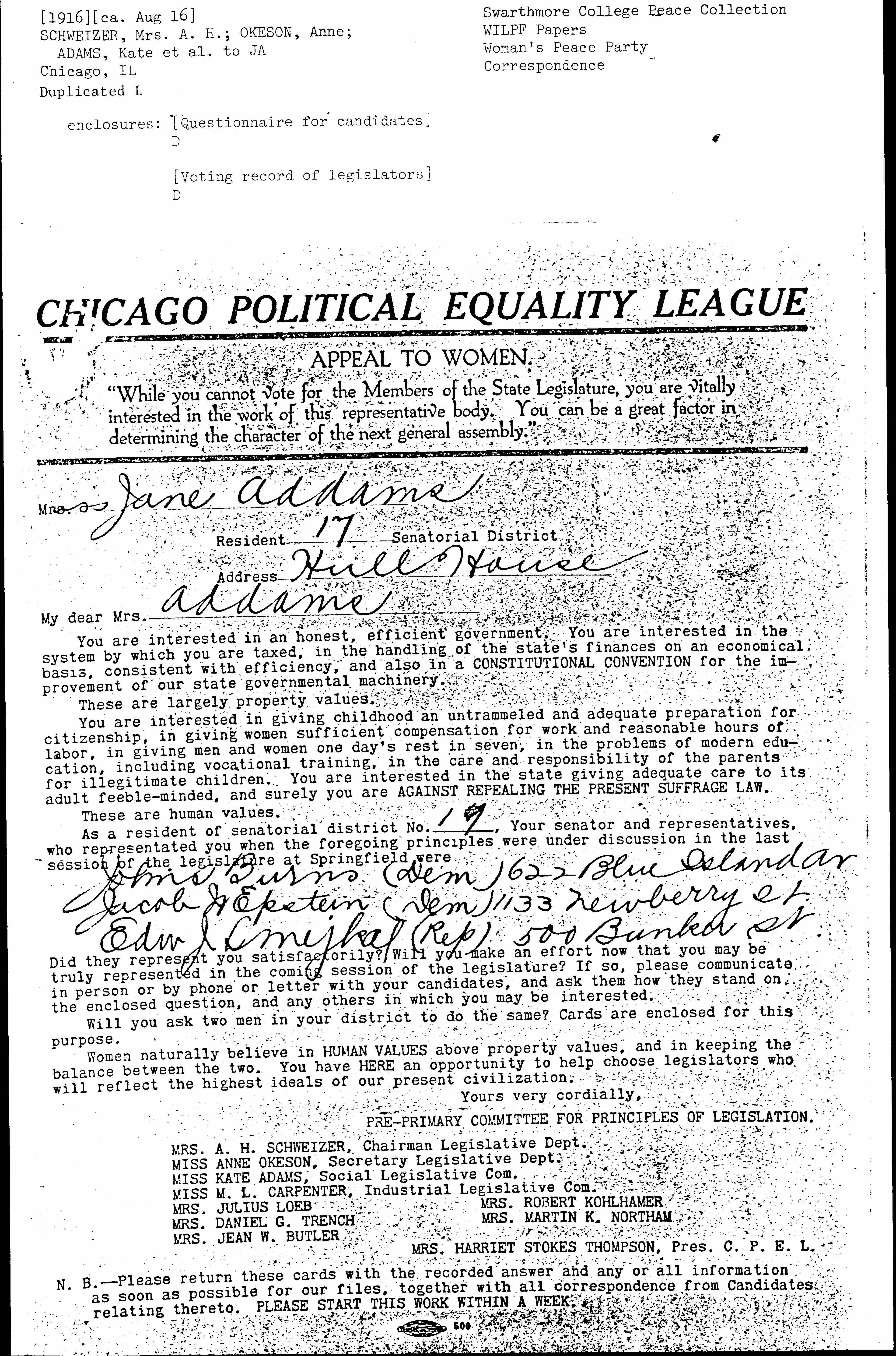 "While you cannot vote for the Members of the State Legislature, you are vitally interested in the work of this representative body. You can be a great factor in determining the character of the next general assembly."