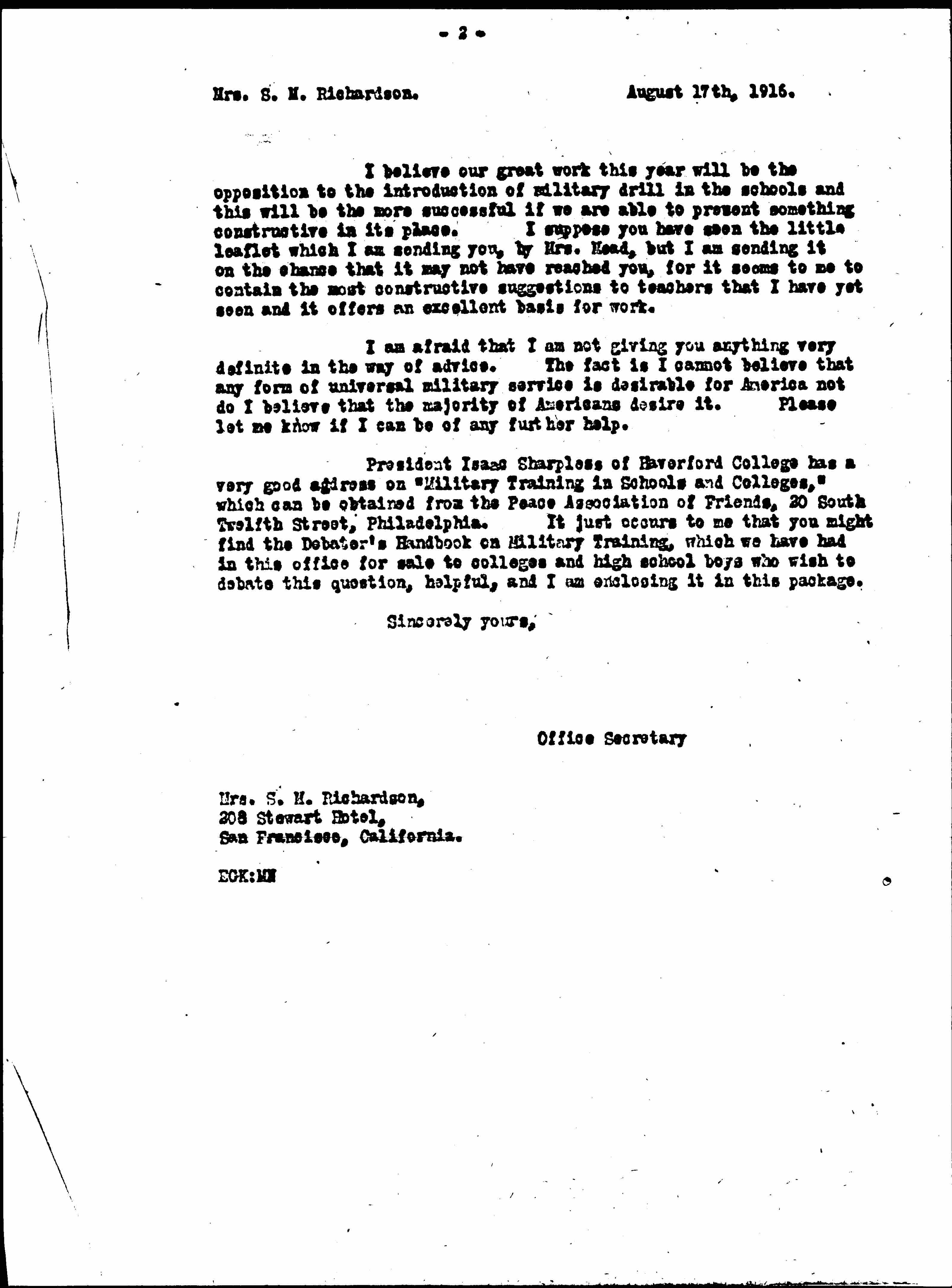 President Isaac Sharpless of Haverford College has a very good address on "Military Training in Schools and Colleges," which can be obtained from the Peace Association of Friends, 20 South Twelfth Street, Philadelphia. It just occurs to me that you might find the Debater's Handbook on Military Training, which we have had in this office for sale to colleges and high school boys who wish to debate this question, helpful, and I am enclosing it in this package.