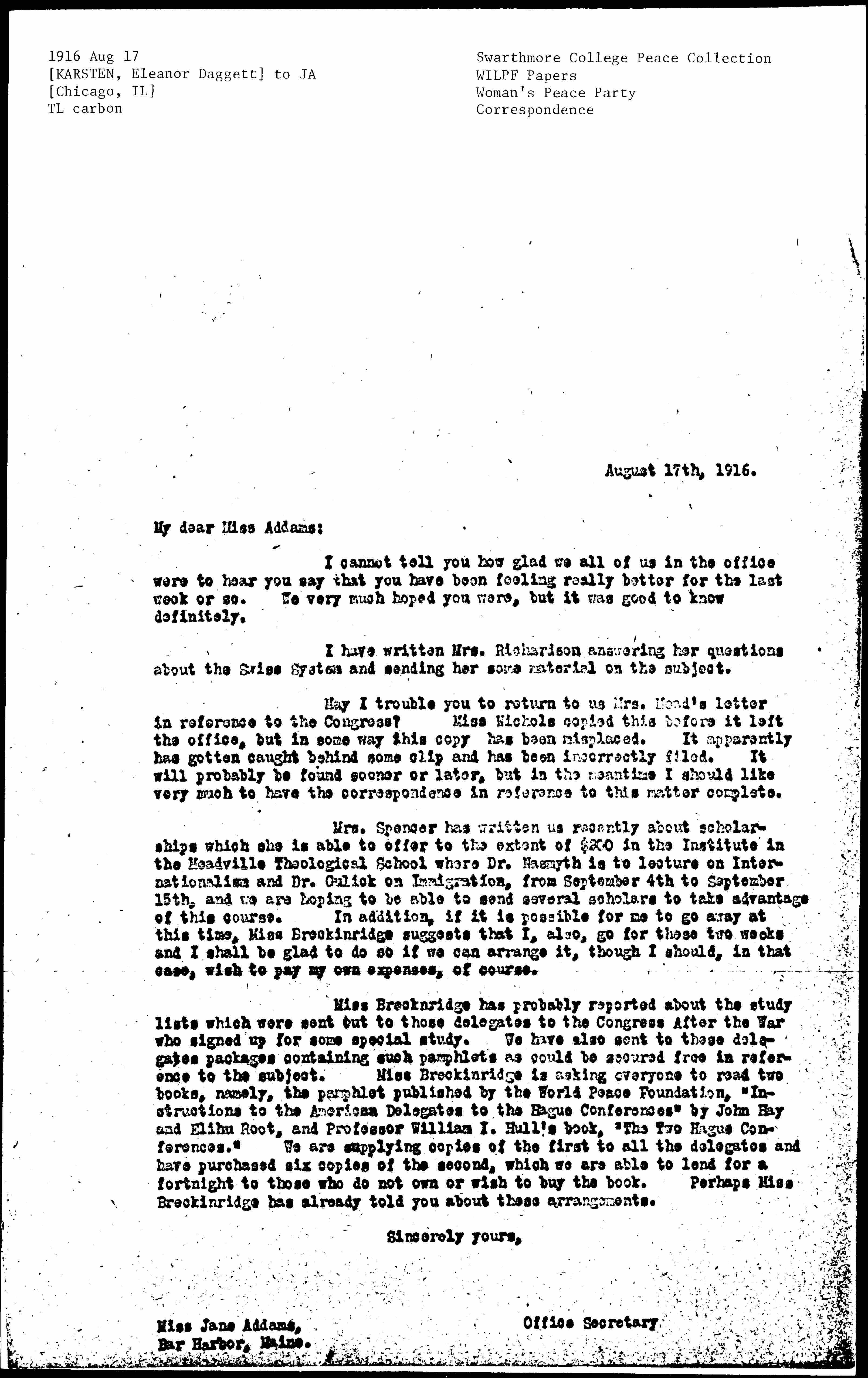 Miss [Breckinridge] has probably reported about the study lists which were sent out to those delegates to the Congress After the War who signed up for some special study. We have also sent to these delegates packages containing such pamphlets as could be secured free in reference to the subject. Miss Breckinridge is asking everyone to read two books, namely, the pamphlet published by the World Peace Foundation, "Instructions to the American Delegates to The Hague Conferences" by John Hay and Elihu Root, and Professor William I. Hull's book, "The Two Hague Conferences." We are supplying copies of the first to all the delegates and have purchased six copies of the second, which we are able to lend for a fortnight to those who do not own or wish to buy the book. Perhaps Miss Breckinridge has already told you about these arrangements.