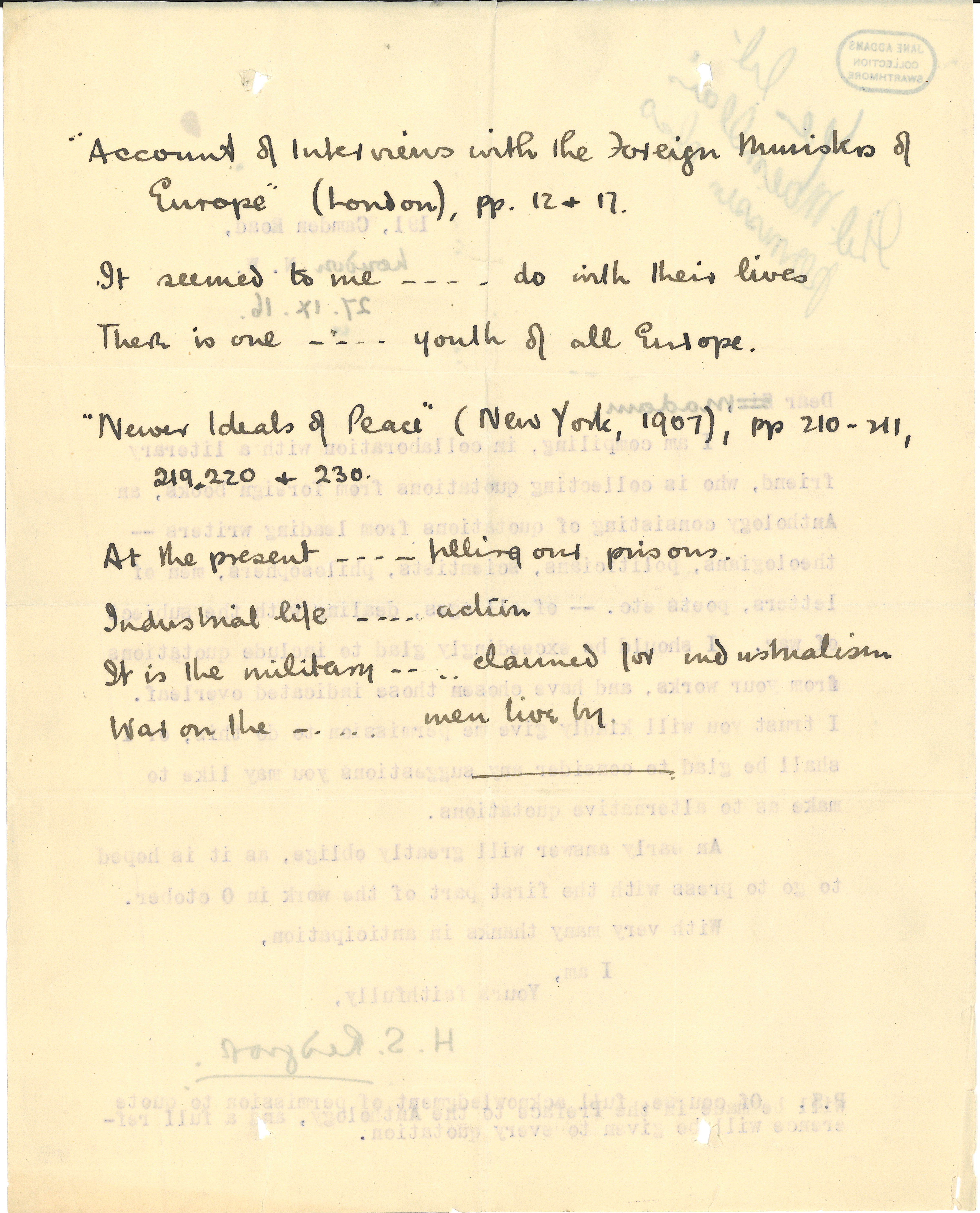 I am compiling, in collaboration with a literary friend, who is collecting quotations from foreign books, an Anthology consisting of quotations from leading writers -- theologians, politicians, scientists, philosophers, men of letters, poets etc. -- of all ages, dealing with the subject of war. I should be exceedingly glad to include quotations from your works, and have chosen those indicated overleaf. I trust you will kindly give me permission to do this, or I shall be glad to consider any suggestions you may like to make as to alternative quotations.