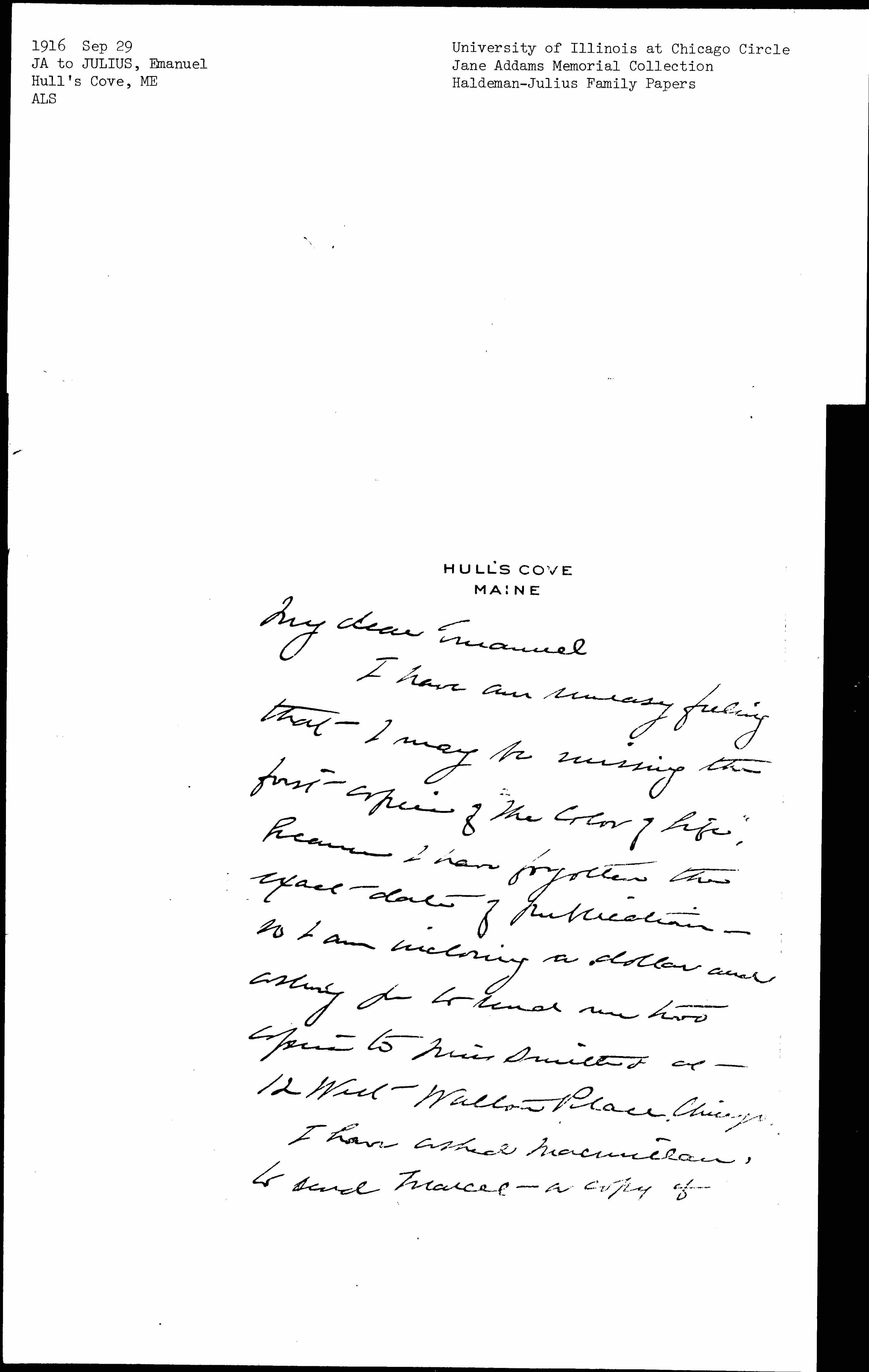 I have an uneasy feeling that I may be missing the first copies of "The Color of Life," because I have forgotten the exact date of publication -- so I am [enclosing] a dollar and asking you to send me two copies to Miss Smith's at 12 West Walton Place, Chicago.