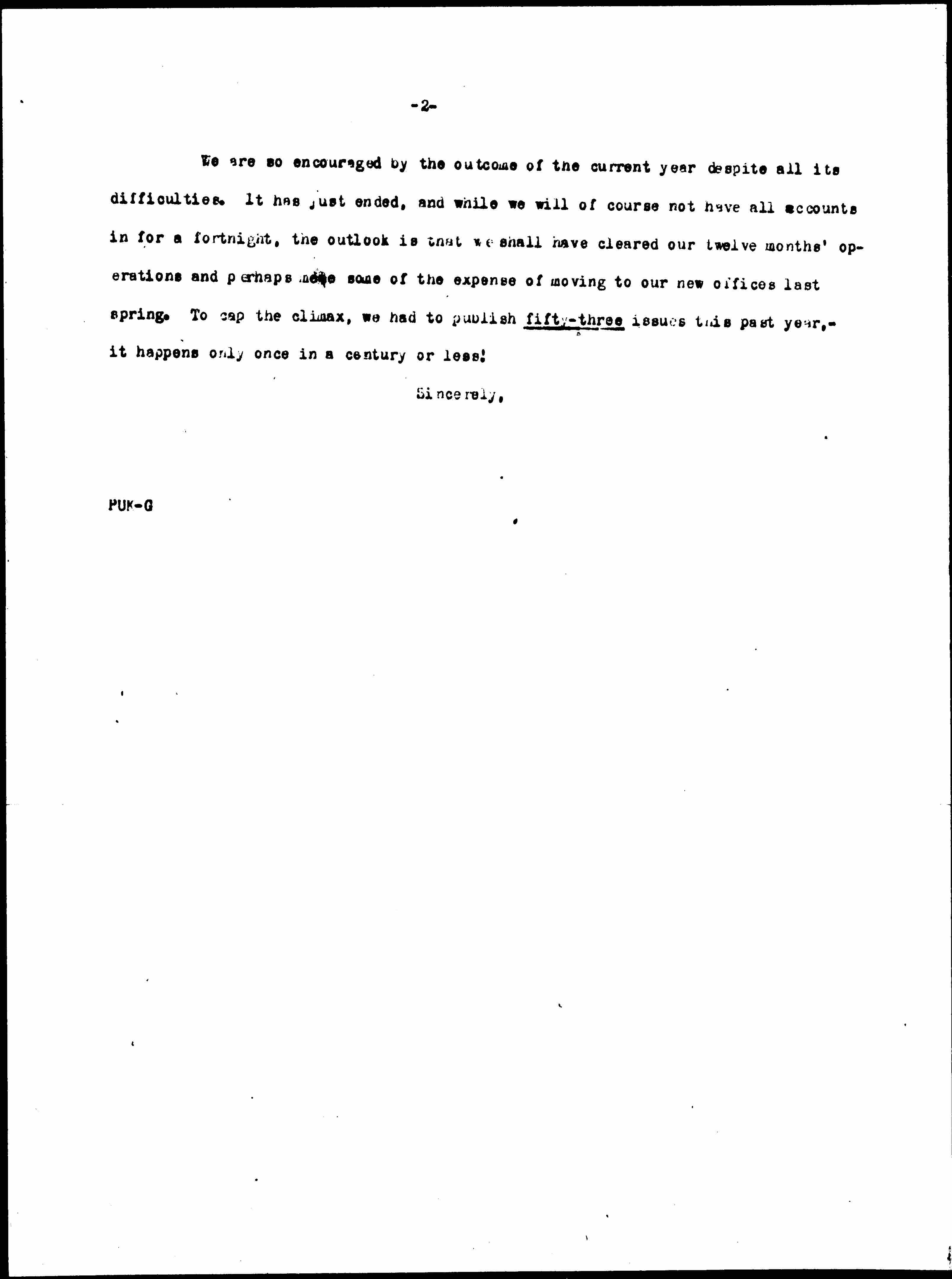 We are so encouraged by the outcome of the current year despite all its difficulties. It has just ended, and while we will of course not have all accounts in for a fortnight, the outlook is that we shall have cleared our twelve months' operations and perhaps [illegible] some of the expense of moving to our new offices last spring. To cap the climax, we had to publish fifty-three issues this past year, -- it happens only once in a century or less!