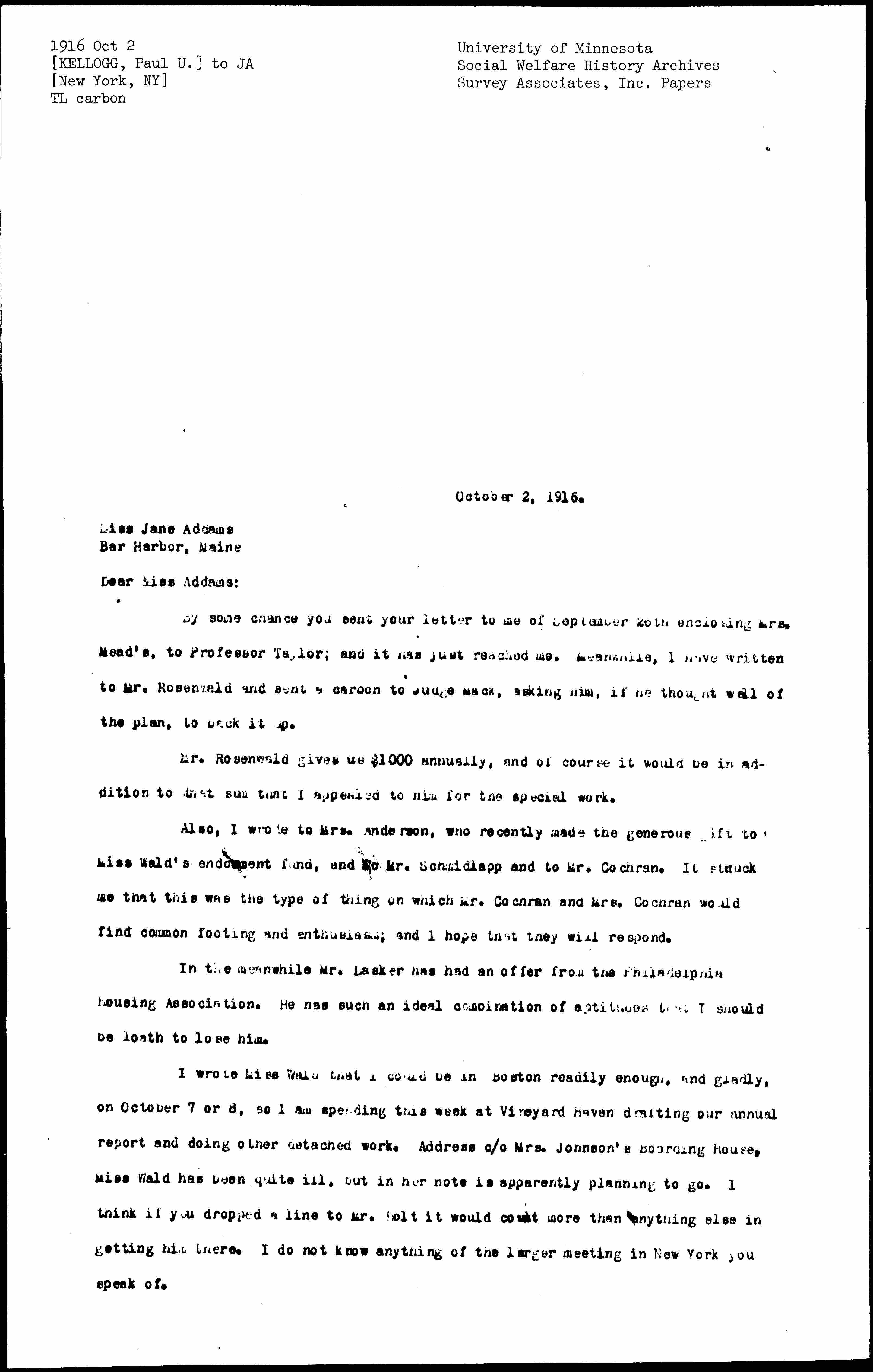 Also, I wrote to Mrs. Anderson, who recently made the generous gift to Miss Wald's endorsement fund, and to Mr. Schmidlapp and to Mr. Cochran. It struck me that this was the type of thing on which Mr. Cochran and Mrs. Cochran would find common footing and enthusiasm; and I hope that they will respond.