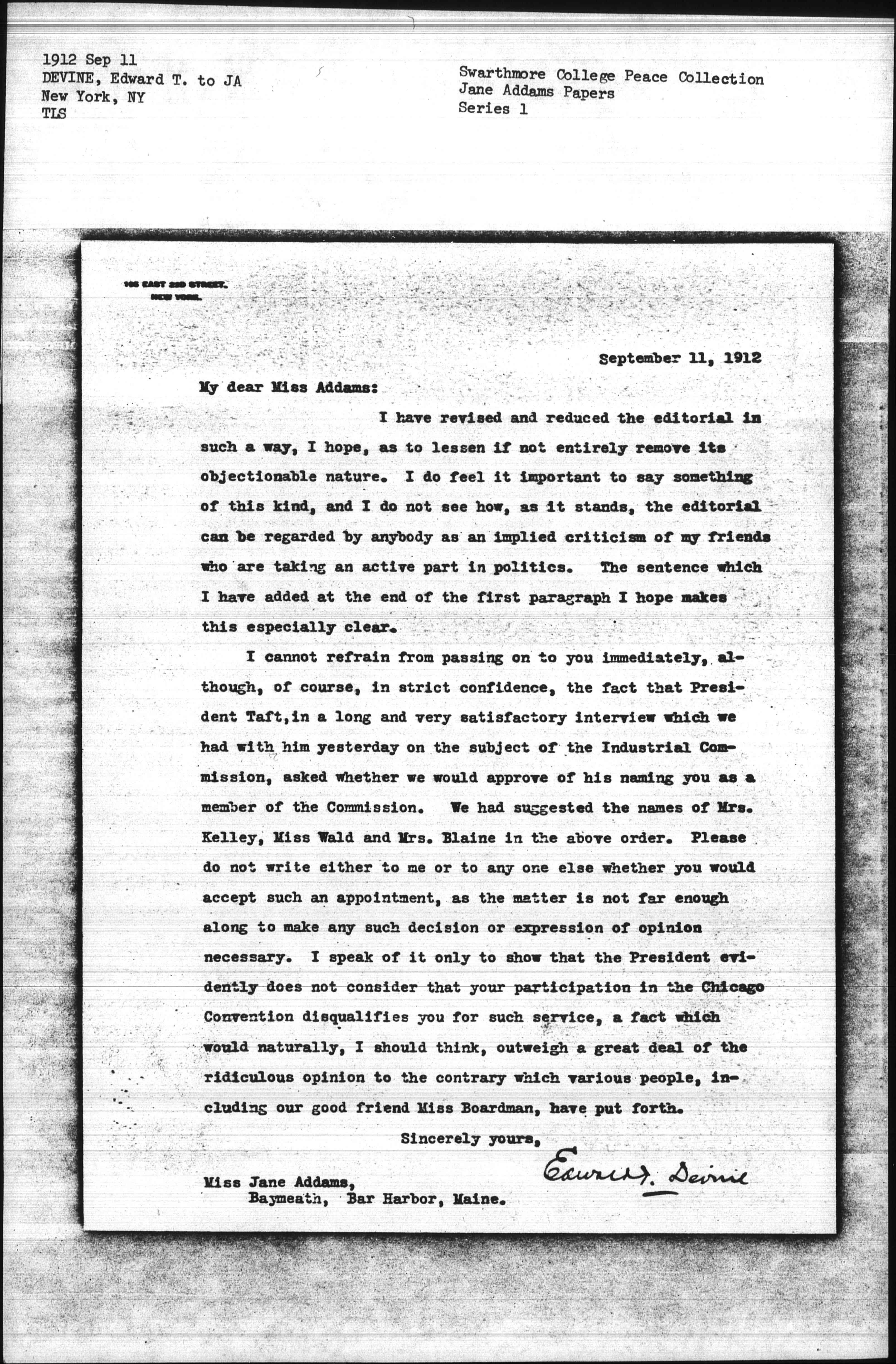 I cannot refrain from passing on to you immediately, although, of course, in strict confidence, the fact that President Taft, in a long and very satisfactory interview which we had with him yesterday on the subject of the Industrial Commission, asked whether we would approve of his naming you as a member of the Commission. We had suggested the names of Mrs. Kelley, Miss Wald, and Mrs. Blaine in the above order. Please do not write either to me or to anyone else whether you would accept such an appointment, as the matter is not far enough along to make any such decision or expression of opinion necessary. I speak of it only to show that the President evidently does not consider that your participation in the Chicago Convention disqualifies you for such service, a fact which would naturally, I should think, outweigh a great deal of the ridiculous opinion to the contrary which various people, including our good friend Miss Boardman, have put forth.