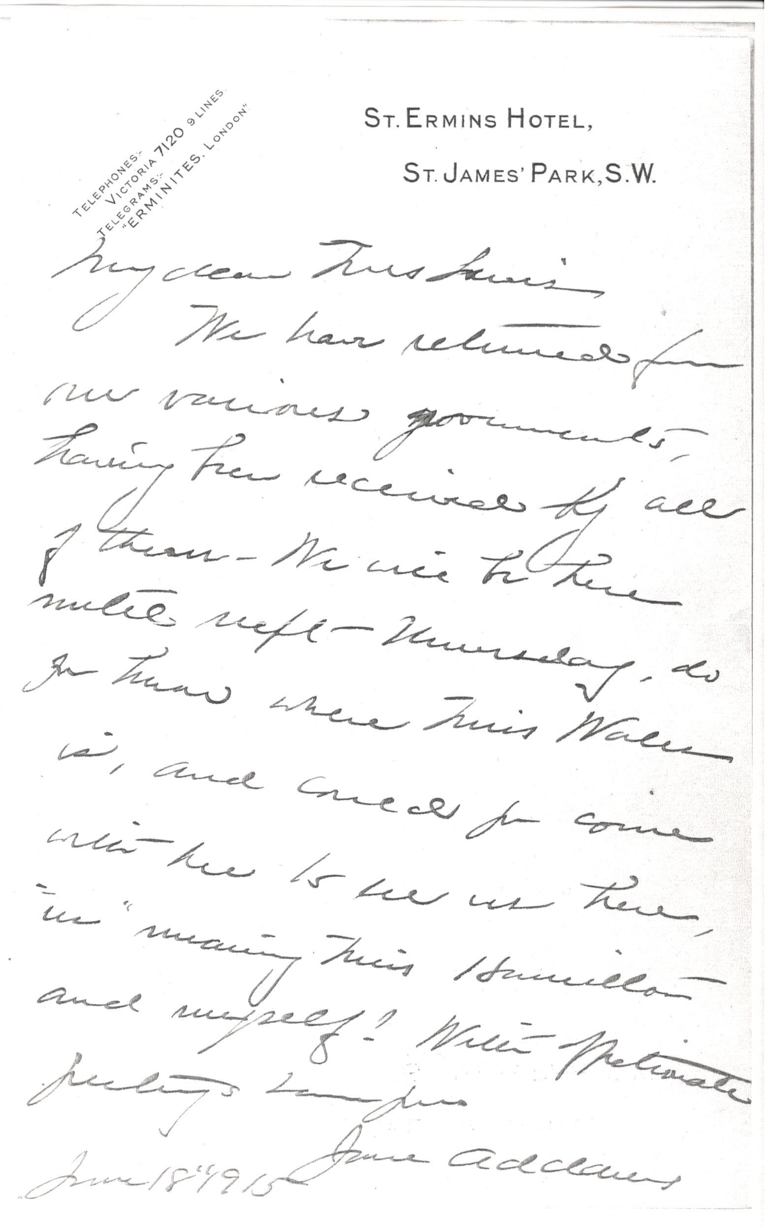 We have returned from our various governments, having been received by all of them. We will be here until next Thursday, do you know where Miss Wales is, and could you come with her to see us here, "us" meaning Miss Hamilton and myself? With affectionate greetings I am yours