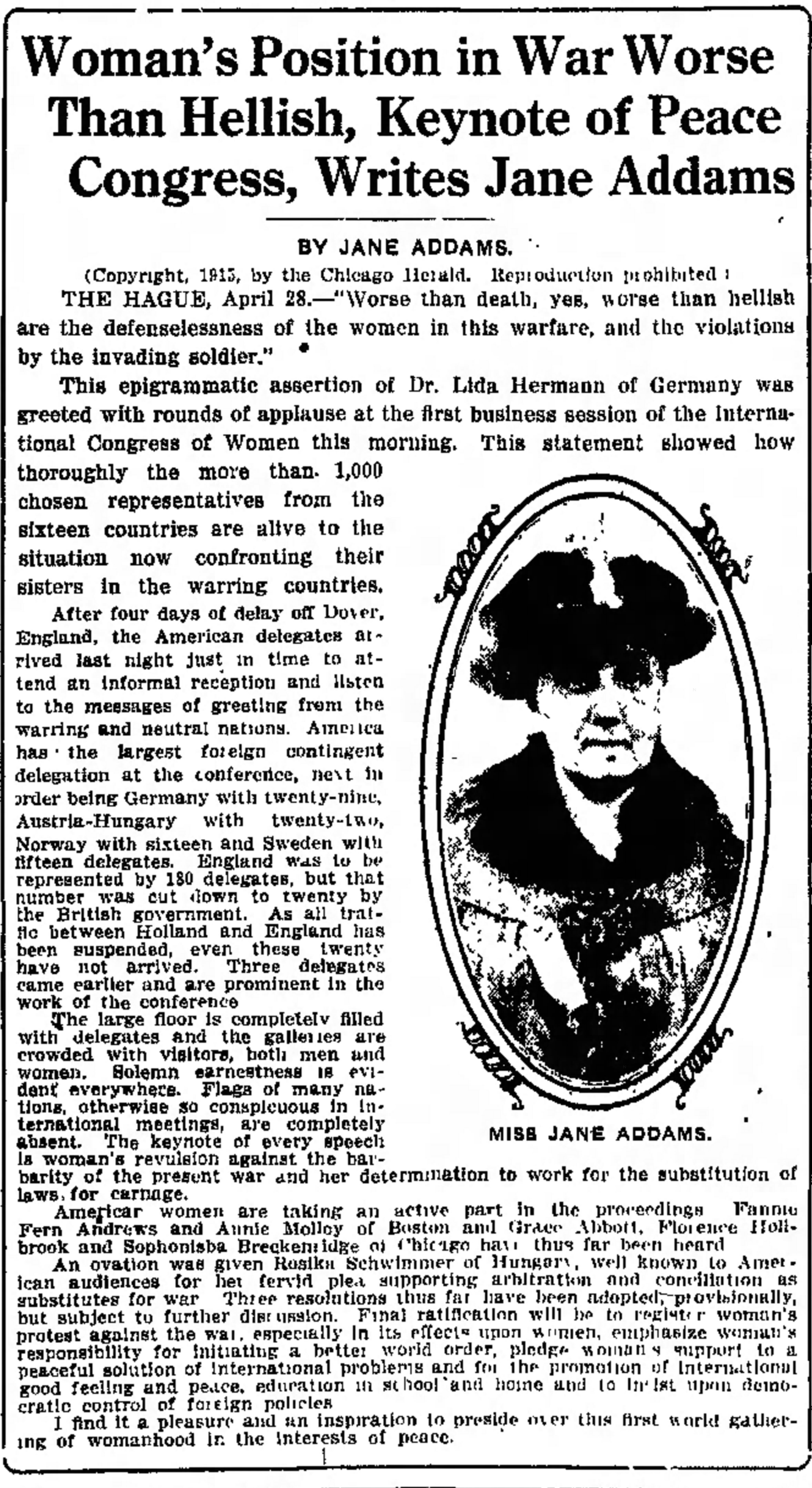 Woman’s Position in War Worse Than Hellish, Keynote of Peace Congress, Writes Jane Addams
