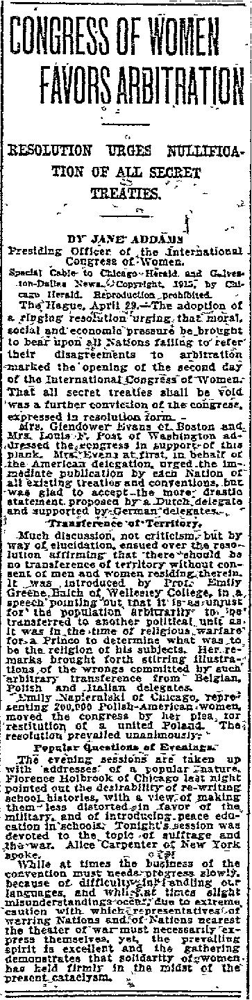 Mrs. Glendower Evans of Boston and Mrs. Louis F. Post of Washington addressed the congress in support of this plank. Mrs. Evans at first, in behalf of the American delegation, urged the immediate publication by each Nation of all existing treaties and conventions, but was glad to accept the more drastic statement proposed by a Dutch delegate and supported by German delegates.