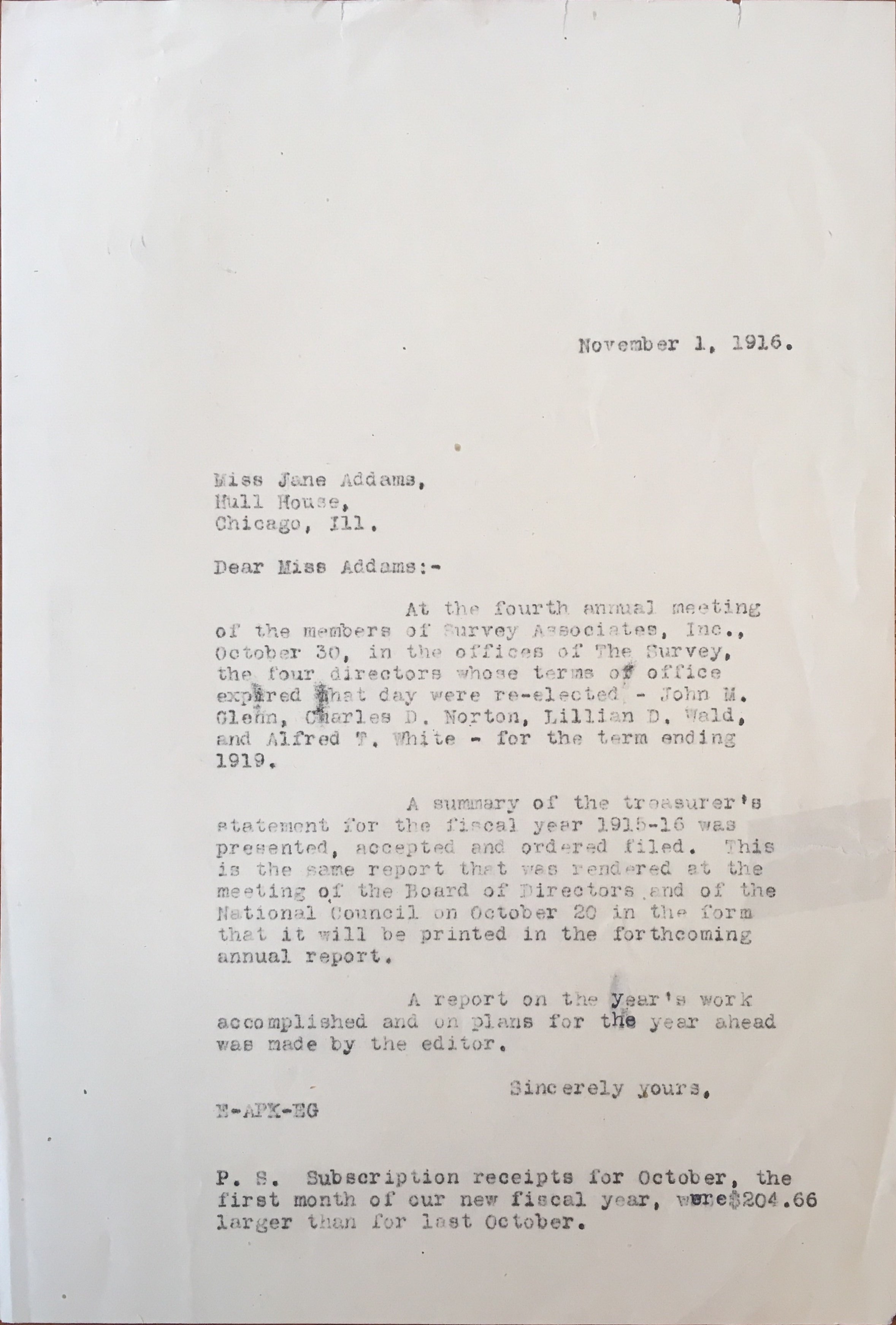 At the fourth annual meeting of the members of Survey Associates, Inc., October 30, in the offices of The Survey, the four directors whose terms of office expired that day were re-elected -- John M. Glenn, Charles D. Norton, Lillian D. Wald, and Alfred T. White -- for the term ending 1919.