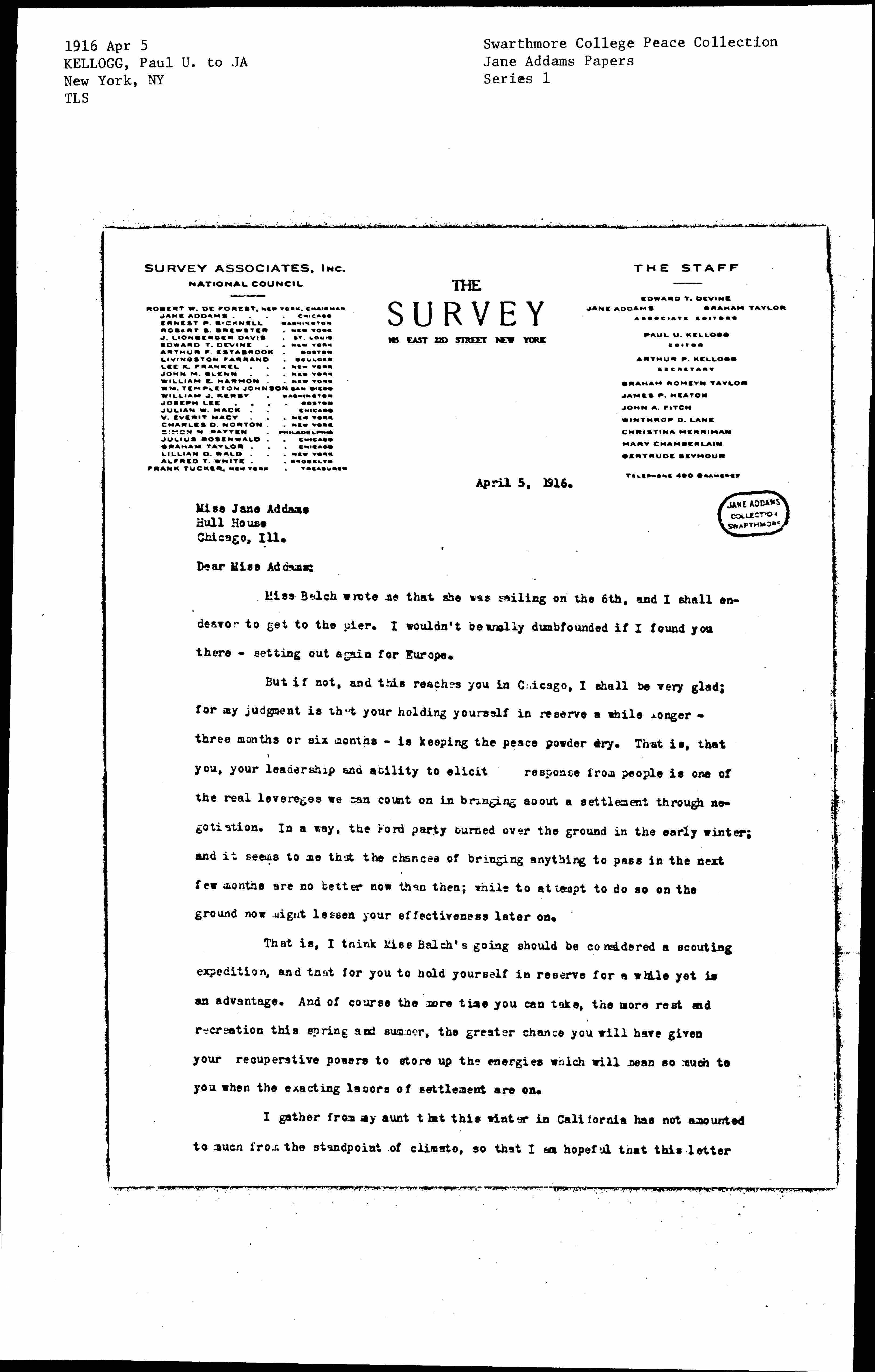 That is, I think Miss Balch's going should be considered a scouting expedition, and that for you to hold yourself in reserve for a while yet is an advantage. And of course the more time you can take, the more rest and recreation this spring and summer, the greater chance you will have given your recuperative powers to store up the energies which will mean so much to you when the exacting labors of settlement are on.