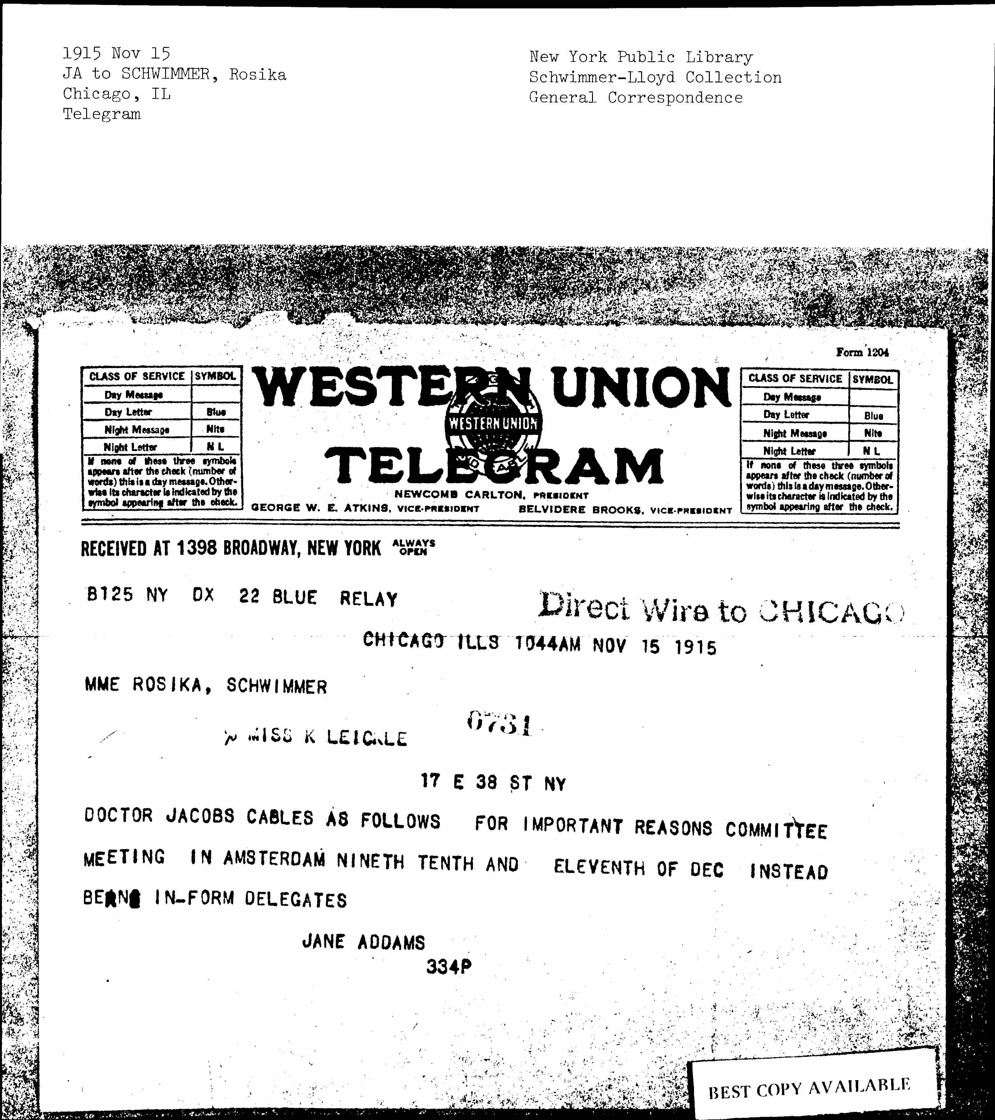 Direct Wire to CHICAGO [stamped]