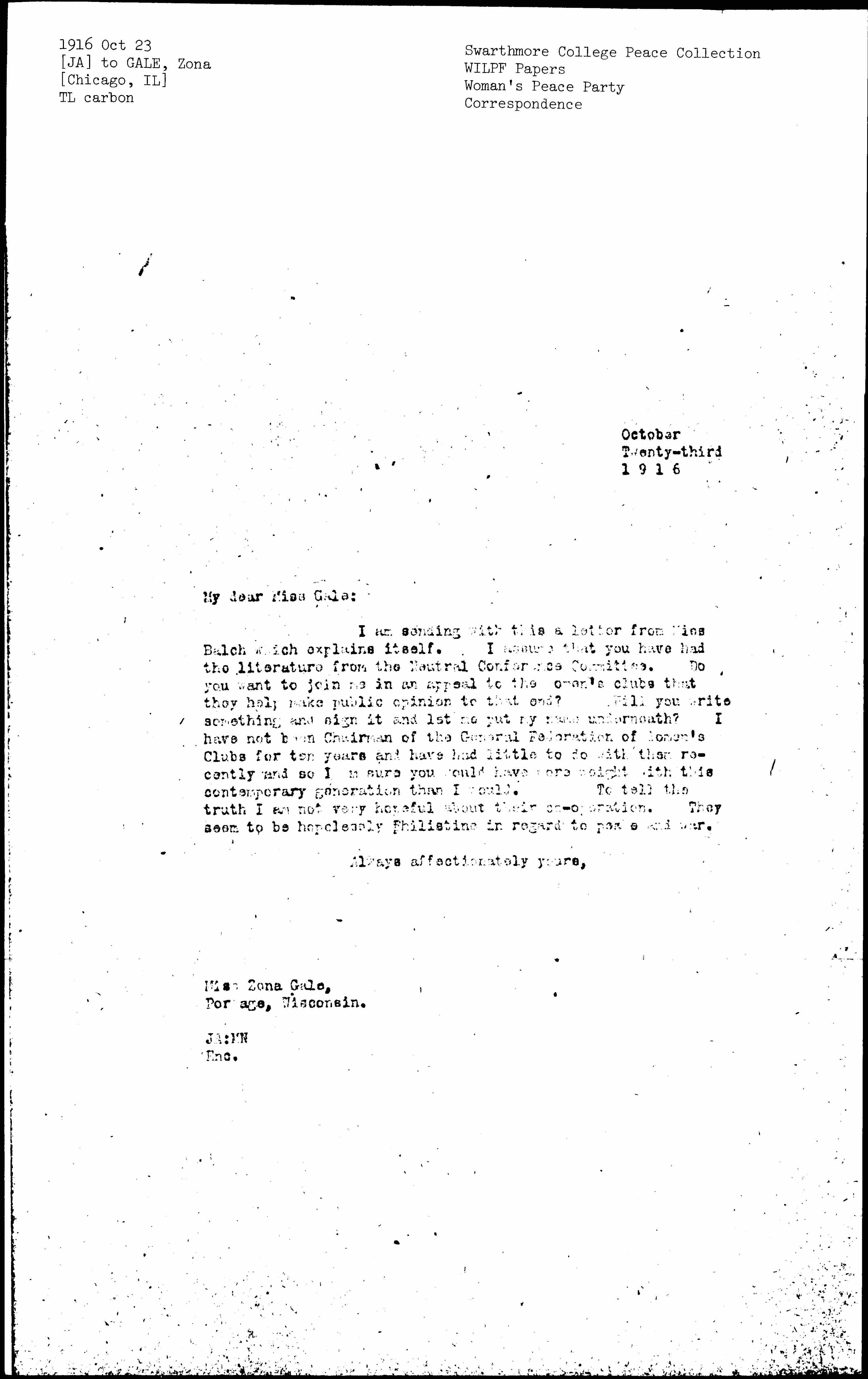 I am sending with this a letter from Miss Balch which explains itself. I assume that you have had the literature from the Neutral Conference Committee. Do you want to join as in an appeal to the women’s clubs that they help make public opinion to that end? Will you write something and sign it and let me put my name underneath? I have not been Chairman of the General Federation of Women’s Clubs for ten years and have had little to do with them recently and so I am sure you would have more weight with this contemporary generation than I would. To tell the truth I am not very hopeful about their [cooperation]. They seem to be hopelessly Philistine in regard to peace and war.