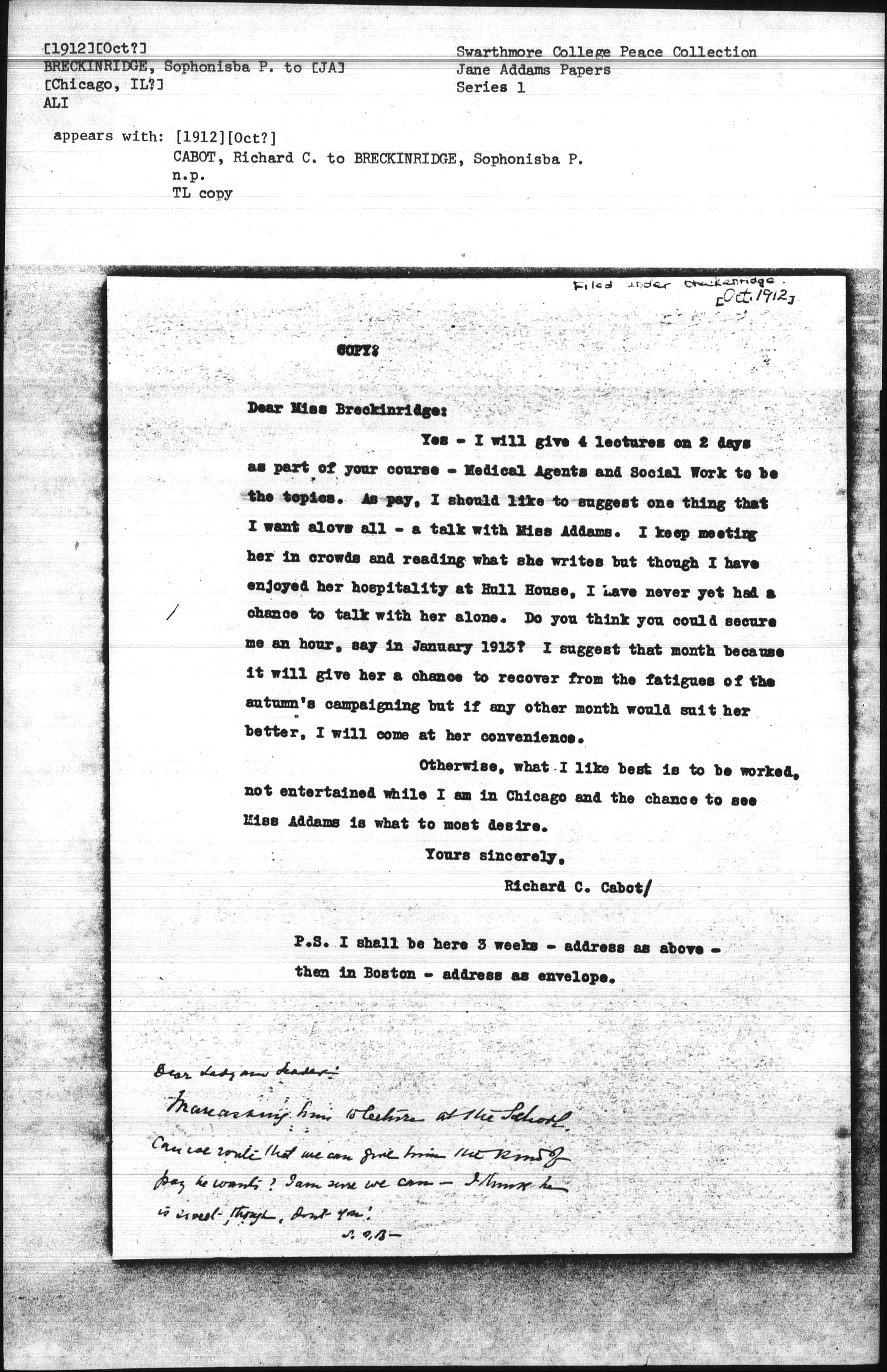 Yes -- I will give 4 lectures on 2 days as part of your course -- Medical Agents and Social Work to be the topics. As pay, I should like to suggest one thing that I want [above] all -- a talk with Miss Addams. I keep meeting her in crowds and reading what she writes but though I have enjoyed her hospitality at Hull House, I have never yet had a chance to talk with her alone. Do you think you could secure me an hour, say in January 1913? I suggest that month because it will give her a chance to recover from the fatigues of the autumn's campaigning but if any other month would suit her better, I will come at her convenience.