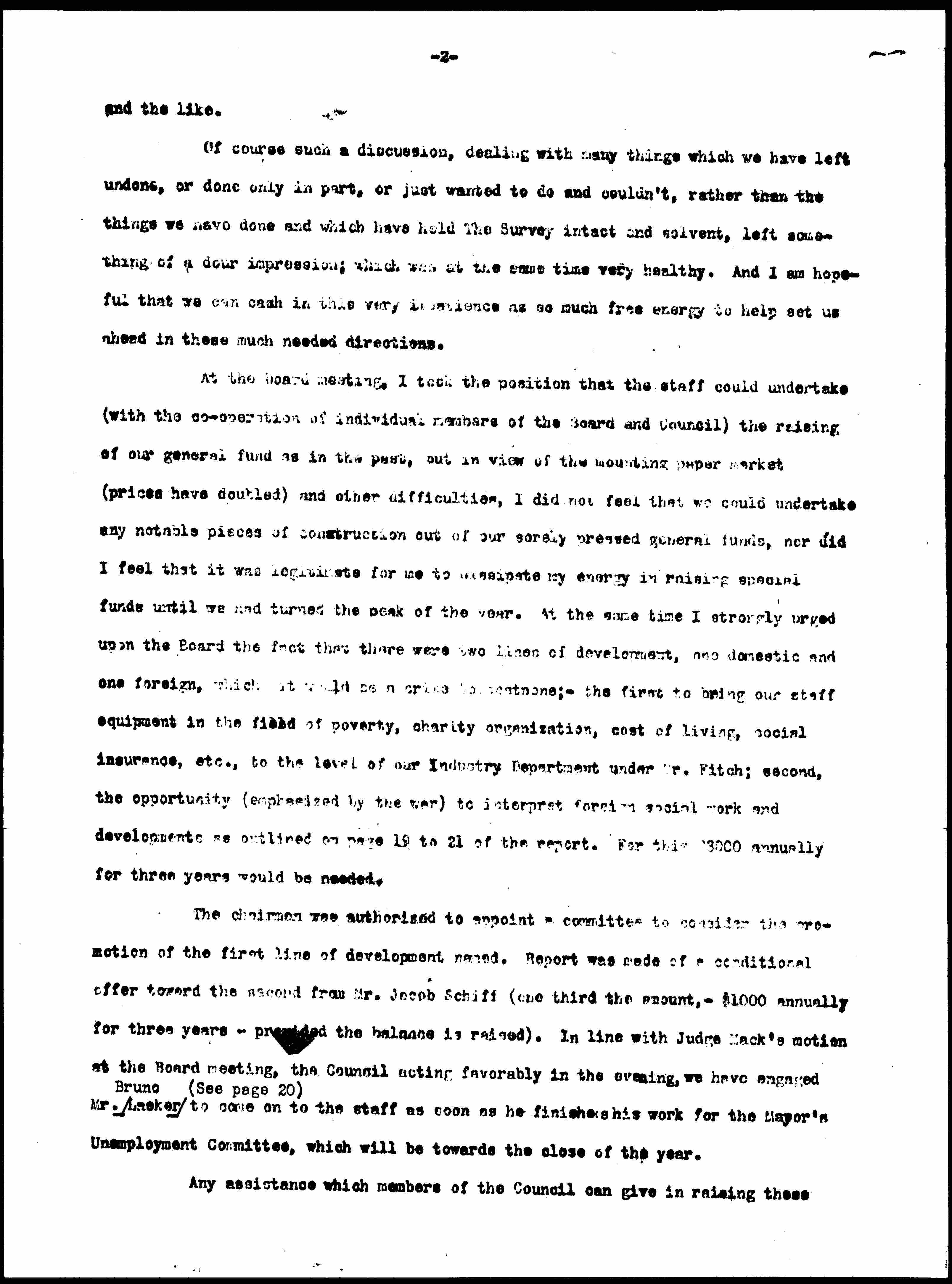 The chairman was authorized to appoint a committee to consider the promotion of the first line of development named. Report was made of a conditional offer toward the second from Mr. Jacob Schiff (one third the amount, -- $1000 annually for three years -- provided the balance is raised). In line with Judge Mack's motion at the Board meeting, the Council acting favorably in the evening, we have engaged Mr. <Bruno> Lasker <(See page 20)> to come on to the staff as soon as he finishes his work for the Mayor's Unemployment Committee, which will be towards the close of the year.