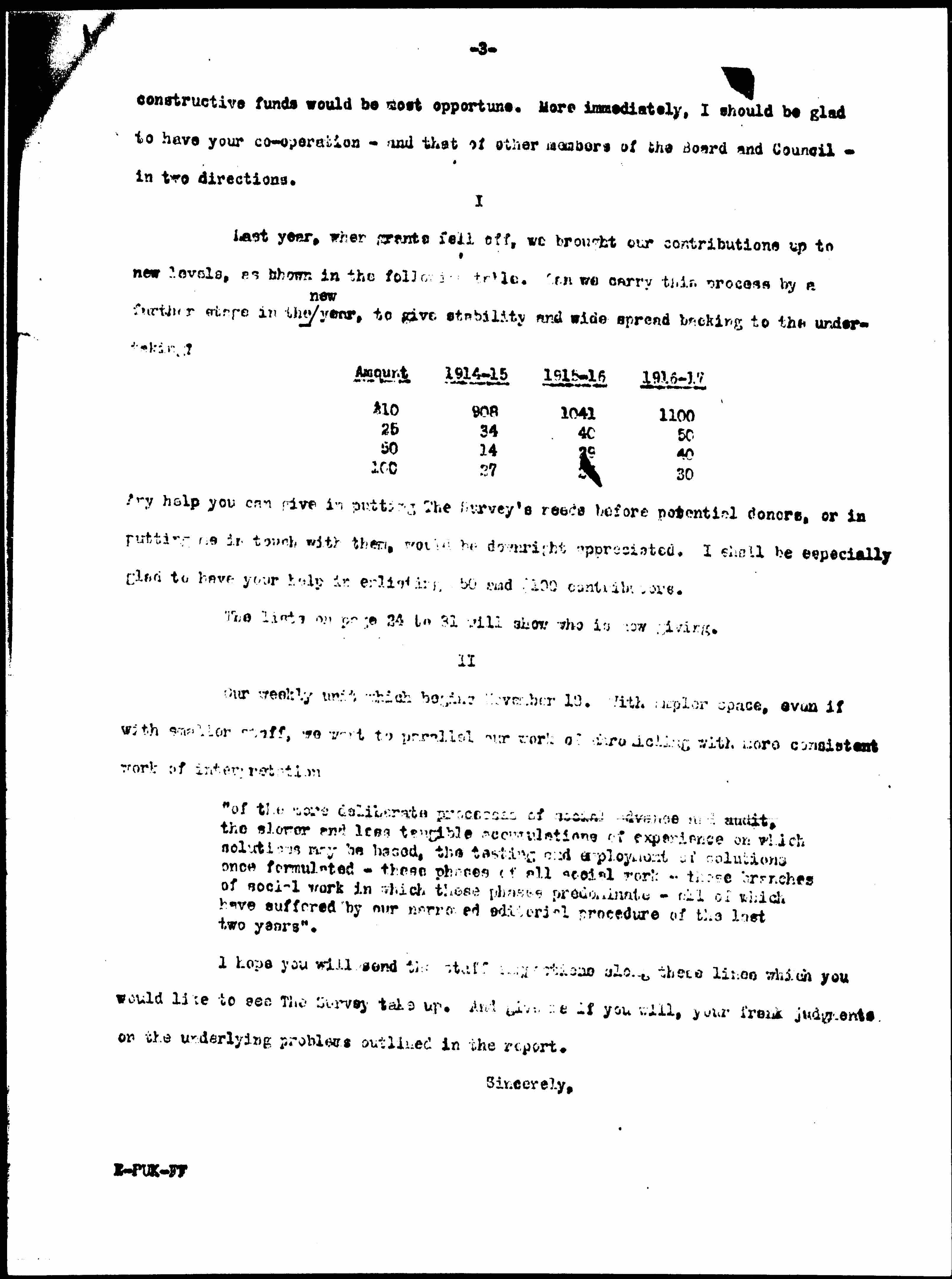Last year, when grants fell off, we brought our contributions up to new levels, as shown in the following table. Can we carry this process by a further stage in the <new> year, to give stability and [widespread] backing to the undertaking?