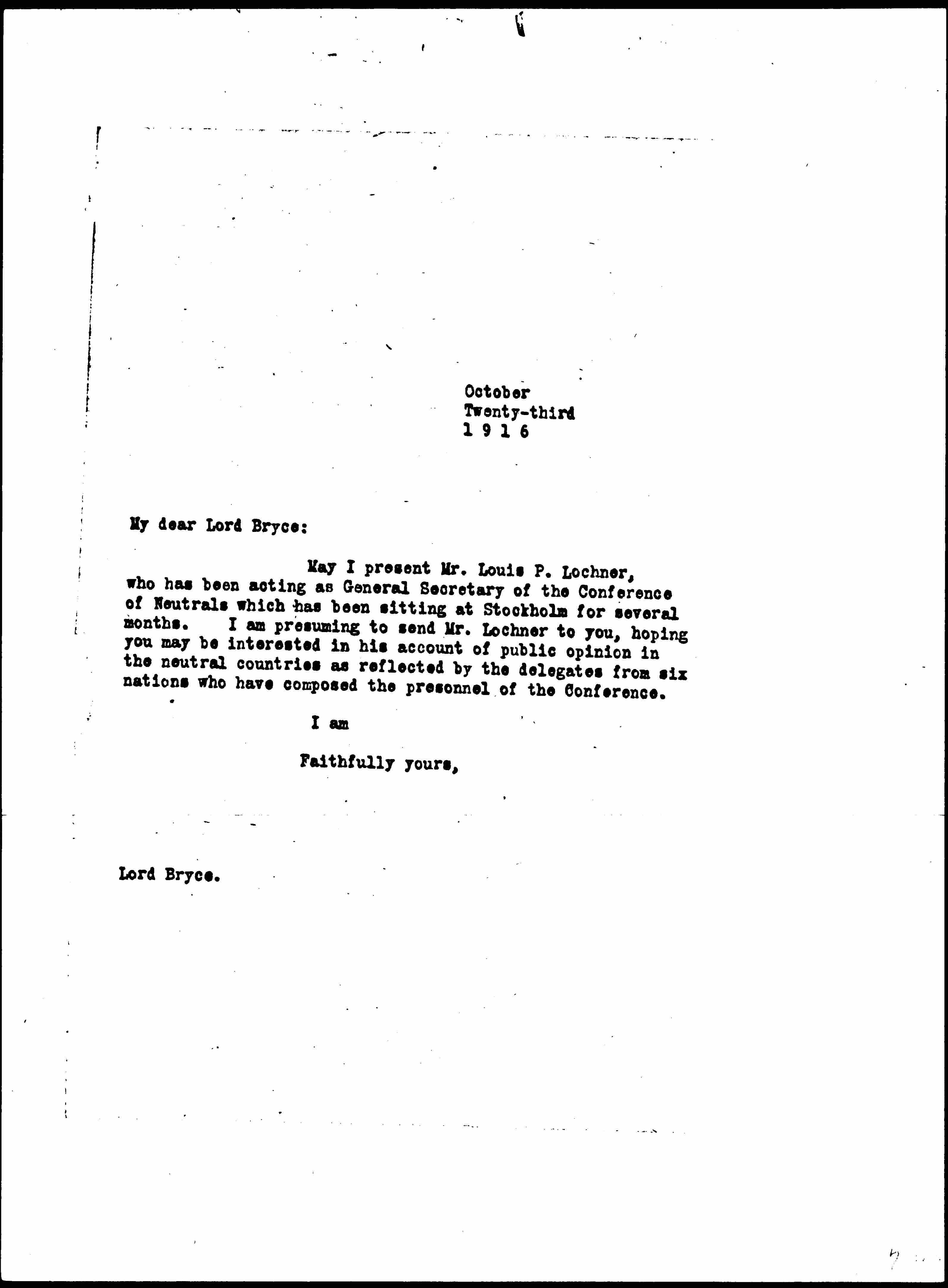 May I present Mr. Louis P. Lochner, who has been acting as General Secretary of the Conference of Neutrals which has been sitting at Stockholm for several months. I am presuming to send Mr. Lochner to you, hoping you may be interested in his account of public opinion in the neutral countries as reflected by the delegates from six nations who have composed the personnel of the Conference.