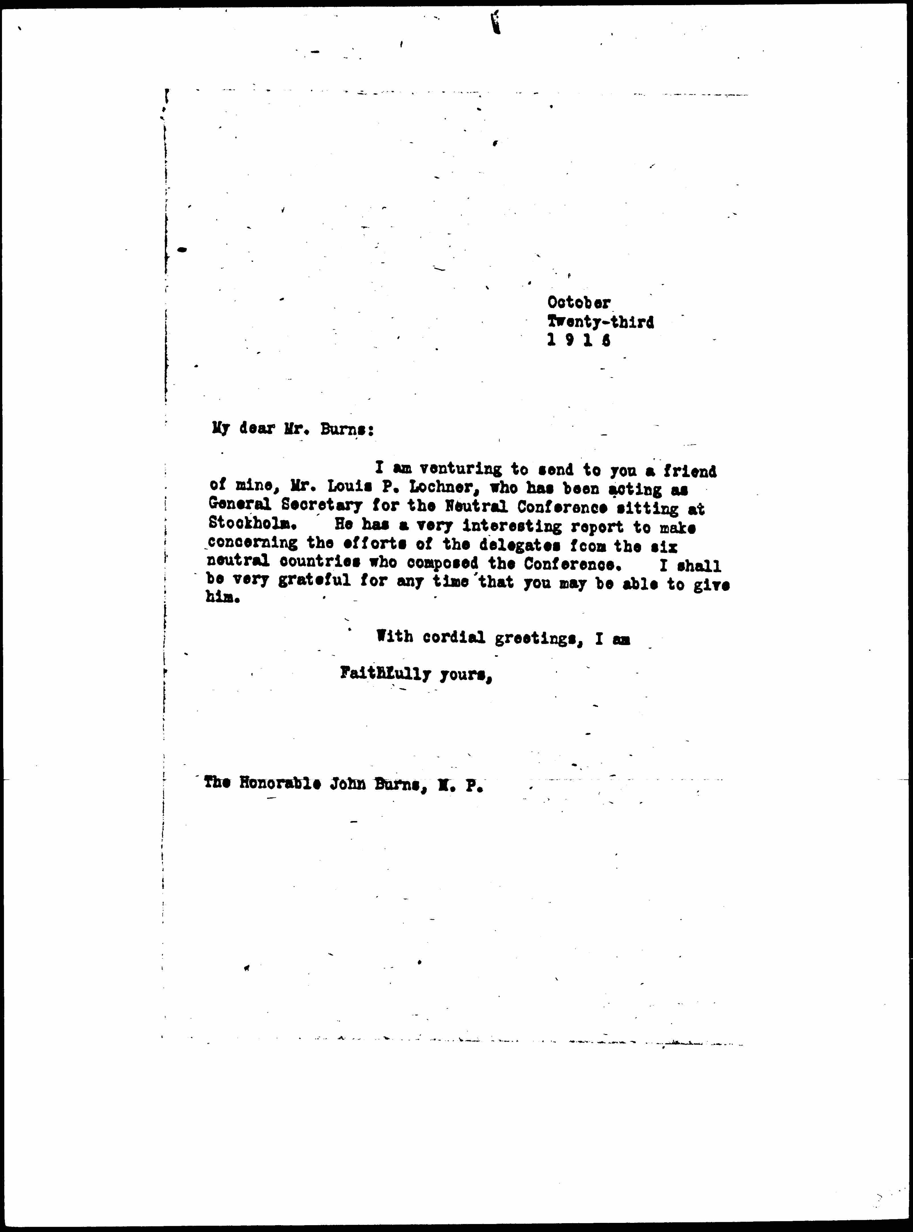 I am venturing to send to you a friend of mine, Mr. Louis P. Lochner, who has been acting as General Secretary for the Neutral Conference sitting at Stockholm. He has a very interesting report to make concerning the efforts of the delegates from the six neutral countries who composed the Conference. I shall be very grateful for any time that you may be able to give him.