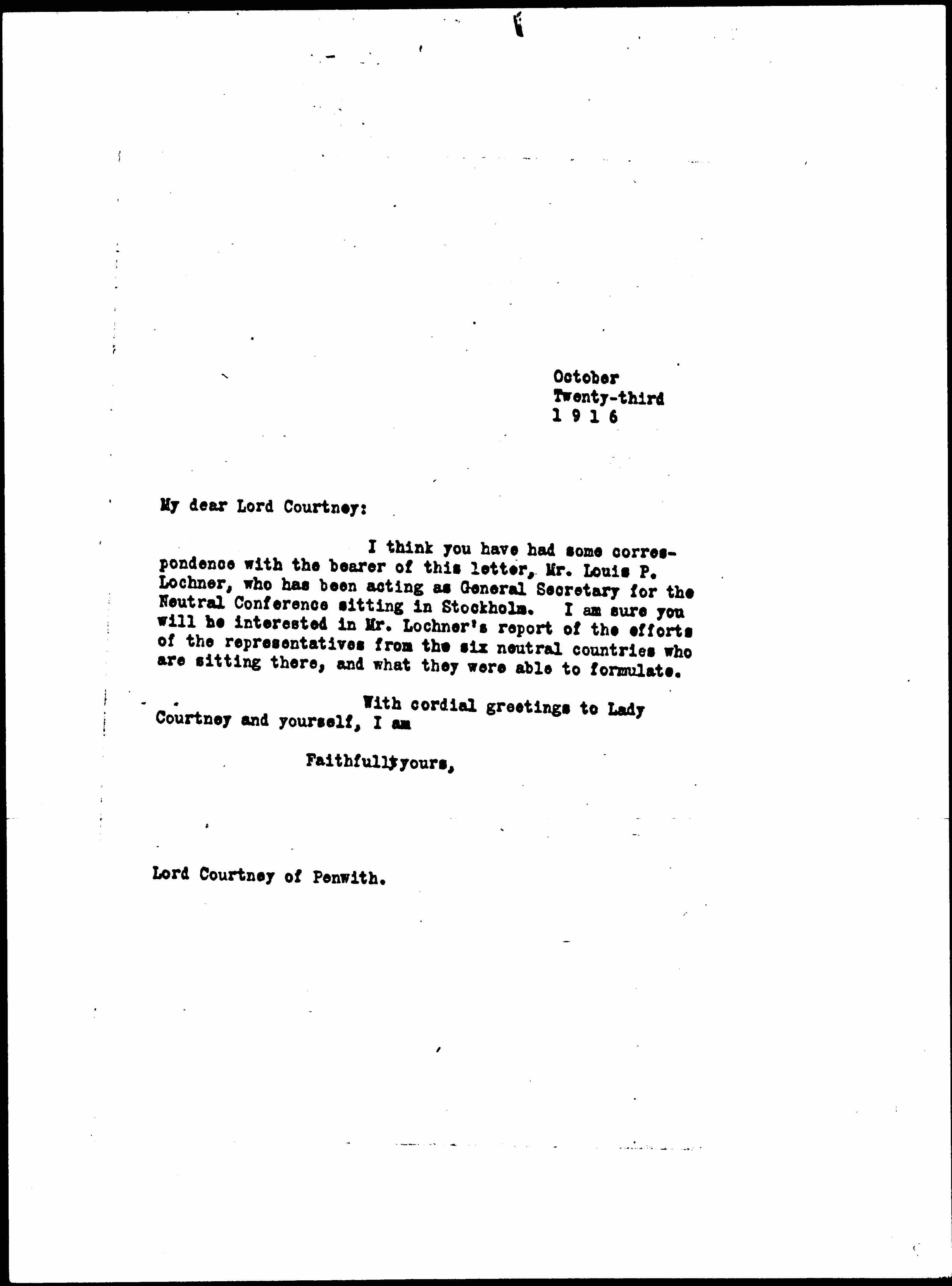I think you have had some correspondence with the bearer of this letter, Mr. Louis P. Lochner, who has been acting as General Secretary for the Neutral Conference sitting in Stockholm. I am sure you will be interested in Mr. Lochner's report of the efforts of the representatives from the six neutral countries who are sitting there, and what they were able to formulate.