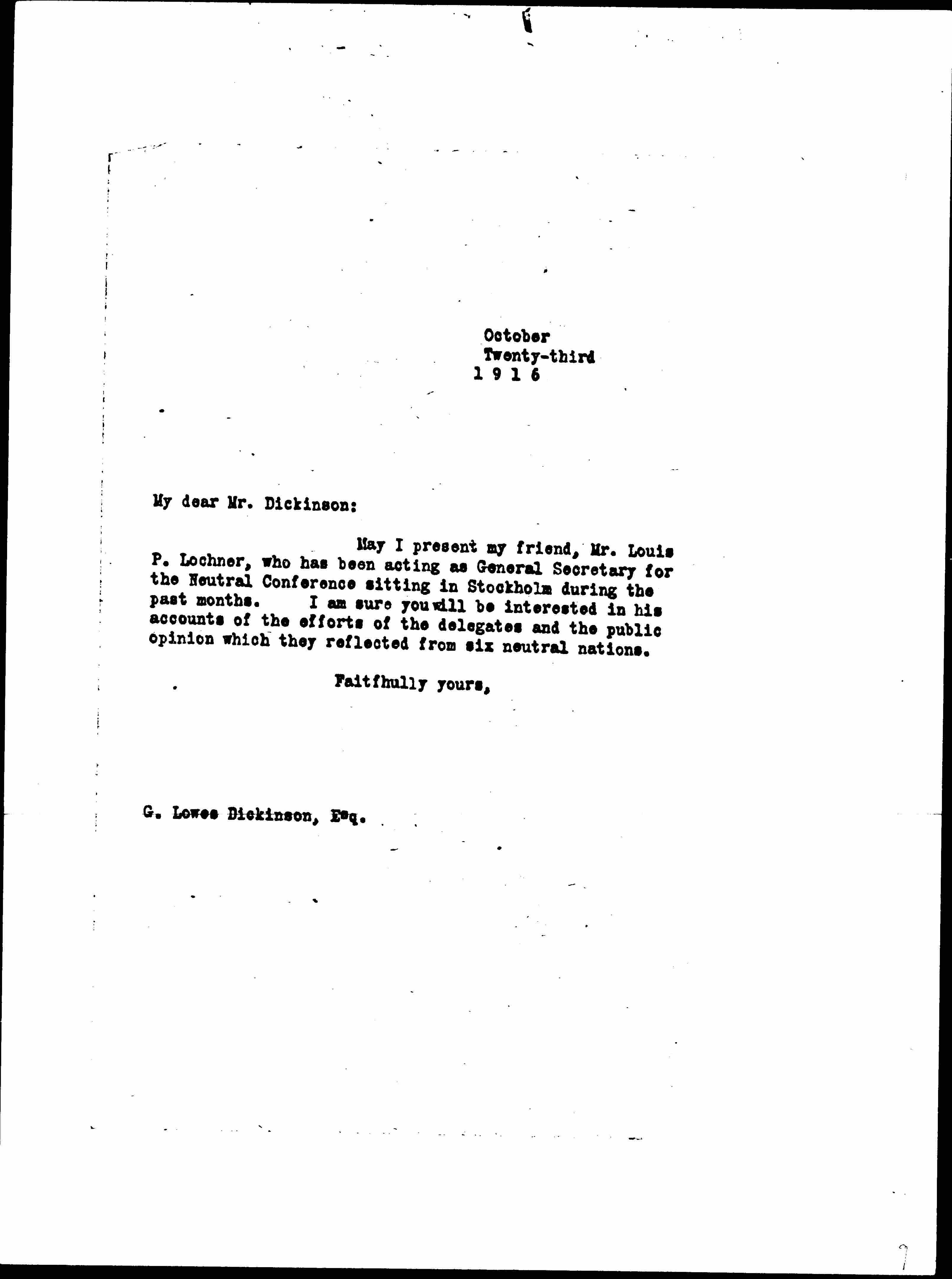 May I present my friend, Mr. Louis P. Lochner, who has been acting as General Secretary for the Neutral Conference sitting in Stockholm during the past months. I am sure you will be interested in his accounts of the efforts of the delegates and the public opinion which they reflected from six neutral nations.