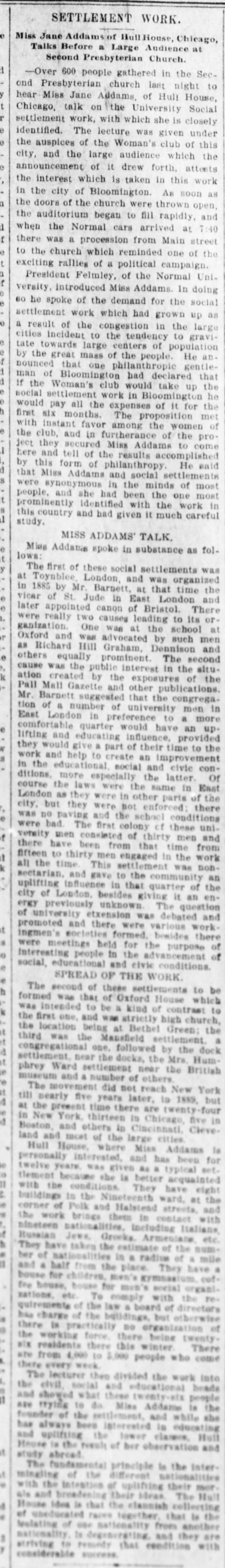 The lecturer then divided the work into the civil, social, and educational beads and showed what these twenty-six people are trying to do. Miss Addams is the founder of the settlement, and while she has always been interested in educating and uplifting the lower classes, Hull House is the result of her observations and study abroad.