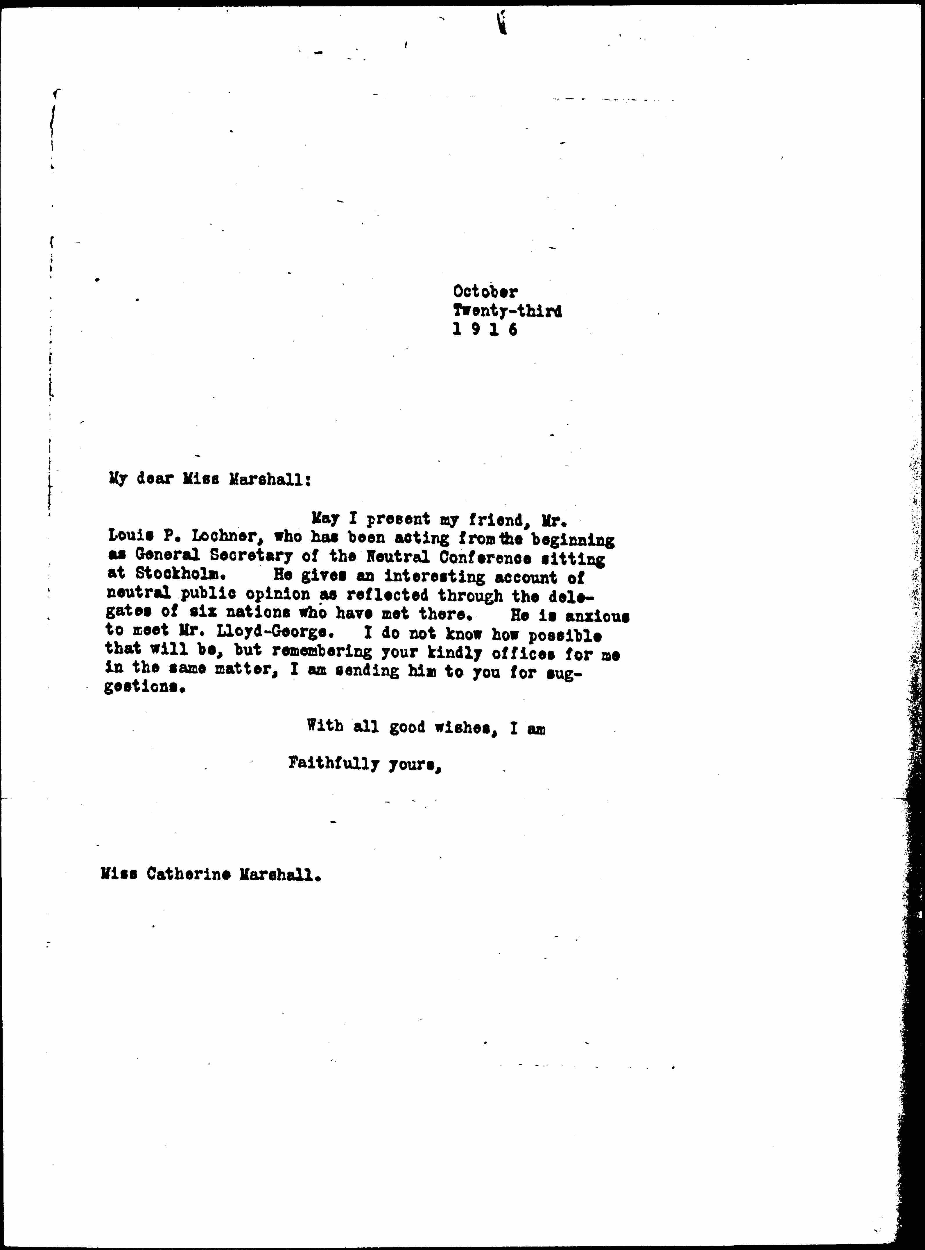 May I present my friend, Mr. Louis P. Lochner, who has been acting from the beginning as General Secretary of the Neutral Conference sitting at Stockholm. He gives an interesting account of neutral public opinion as reflected through the delegates of six nations who have met there. He is anxious to meet Mr. Lloyd-George. I do not know how possible that will be, but remembering your kindly offices for me in the same matter, I am sending him to you for suggestions.