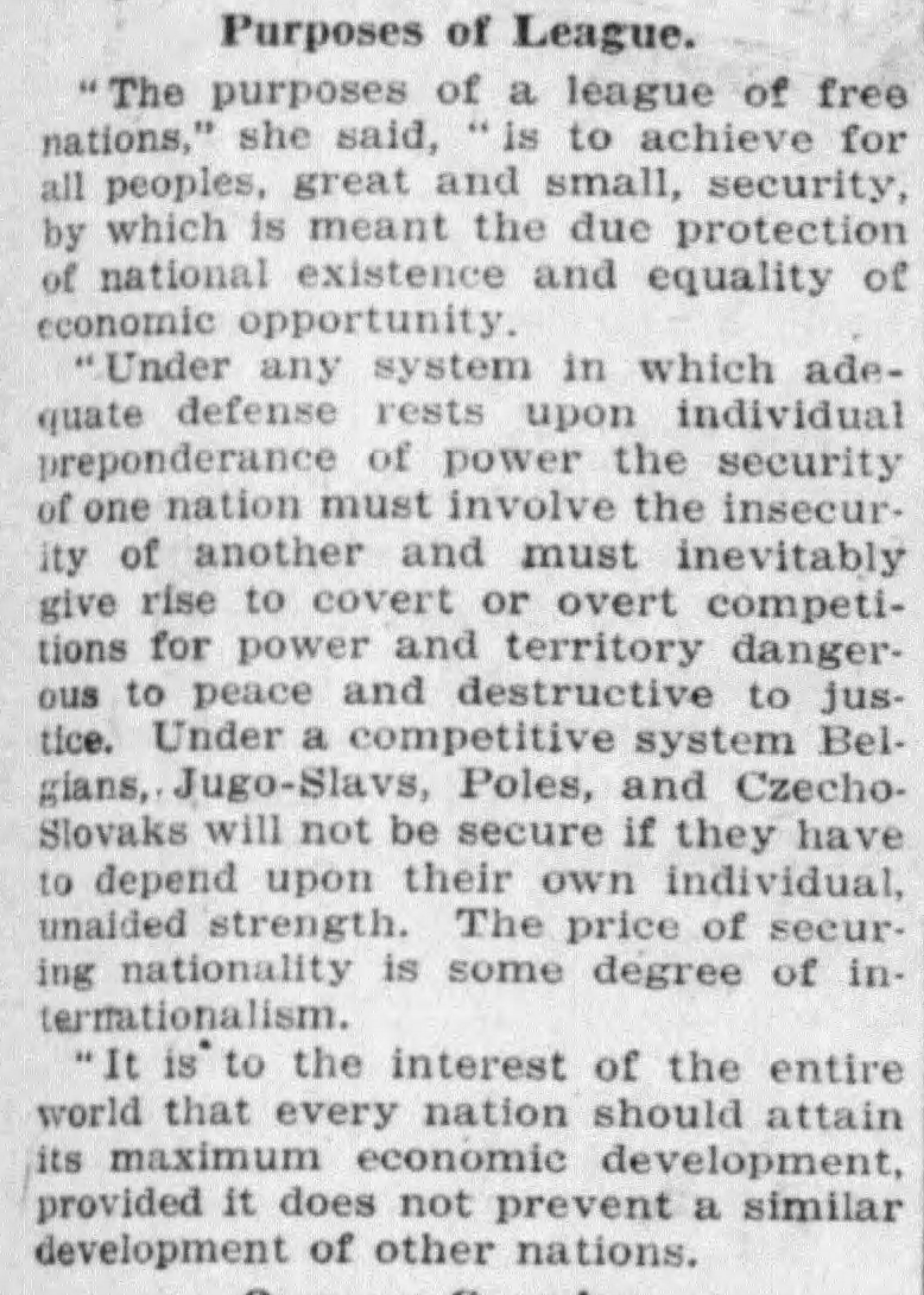 "The purposes of a league of free nations," she said, "is to achieve for all peoples, great and small, security, by which is meant the due protection of national existence and equality of economic opportunity.