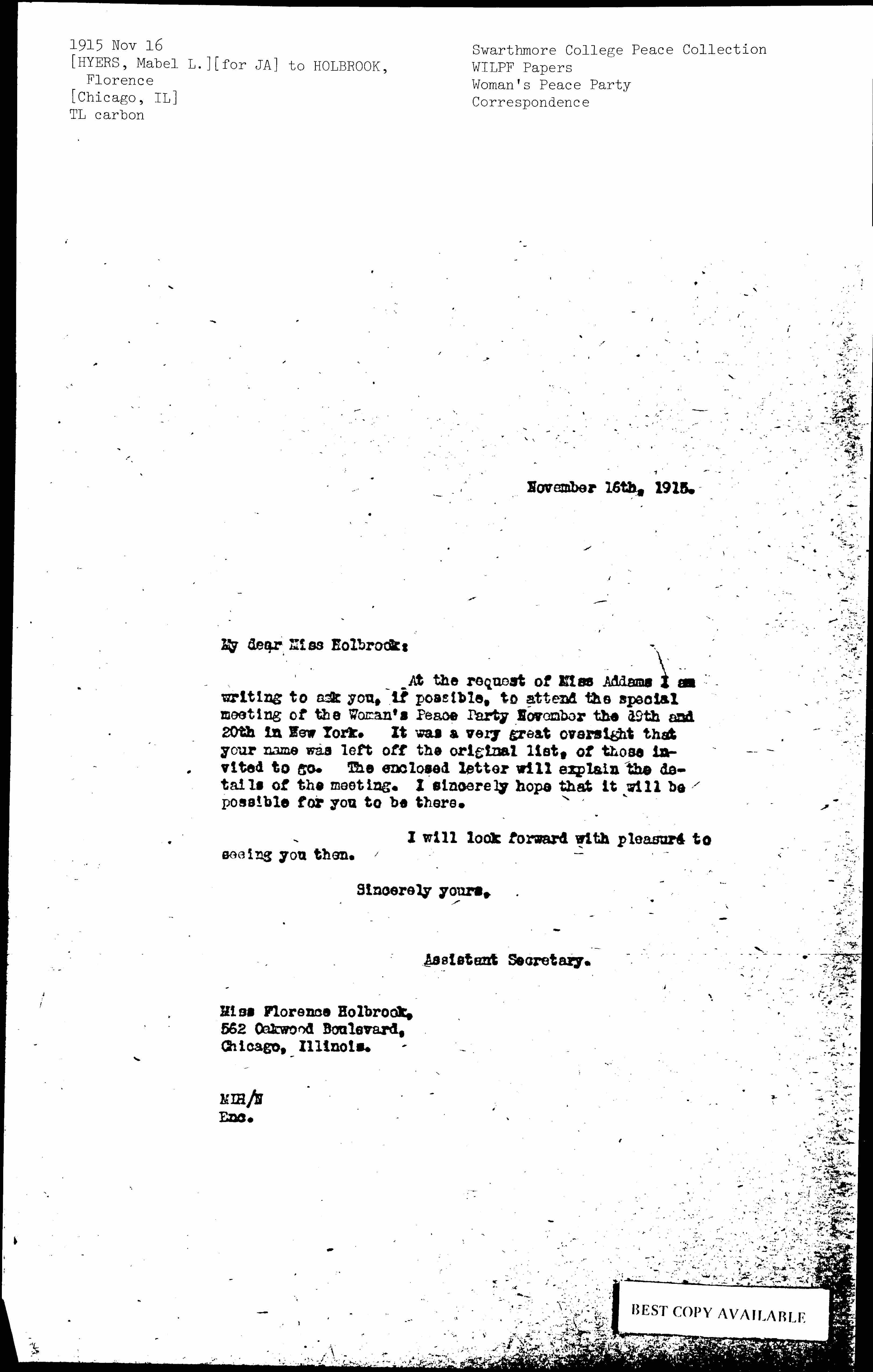 At the request of Miss Addams I am writing to ask you, if possible, to attend the special meeting of the Woman's Peace Party November the 19th and 20th in New York. It was a very great oversight that your name was left off the original list, of those invited to go. The enclosed letter will explain the details of the meeting. I sincerely hope that it will be possible for you to be there.