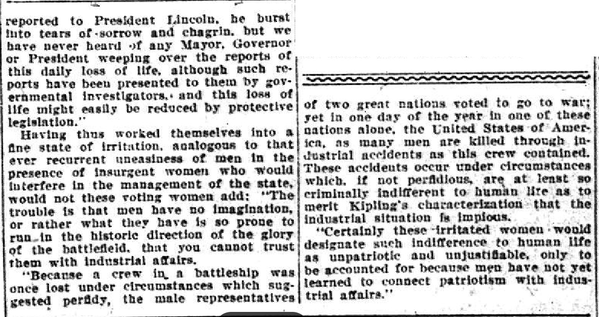 Certainly these irritated women would designate such indifference to human life as unpatriotic and unjustifiable, only to be accounted for because men have not yet learned to connect patriotism with industrial affairs.