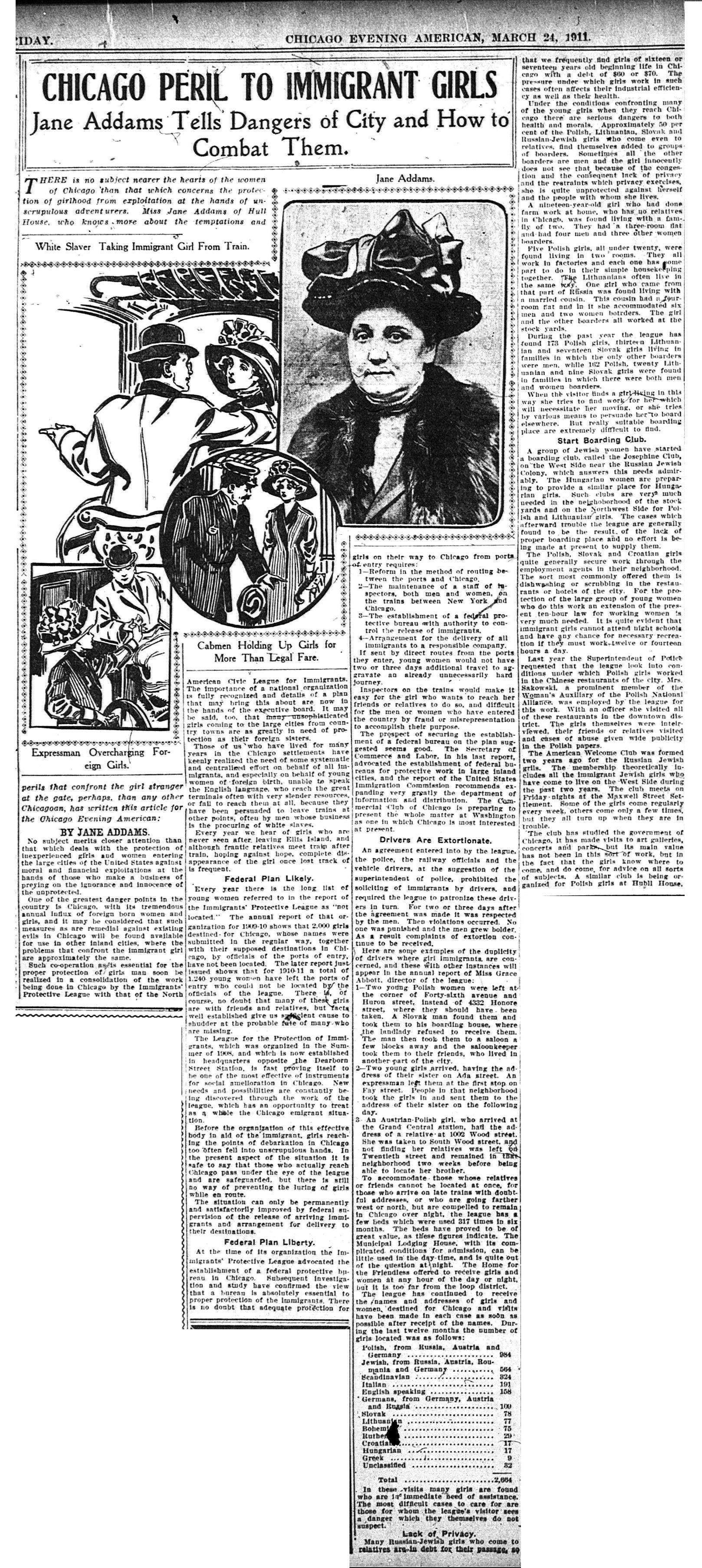 THERE is no subject nearer the hearts of the women of Chicago than that which concerns the protection of girlhood from exploitation at the hands of unscrupulous adventurers. Miss Jane Addams of Hull House, who knows more about the temptations and perils that confront the girl stranger at the gate, perhaps, than any other Chicagoan, has written this article for the Chicago Evening American: