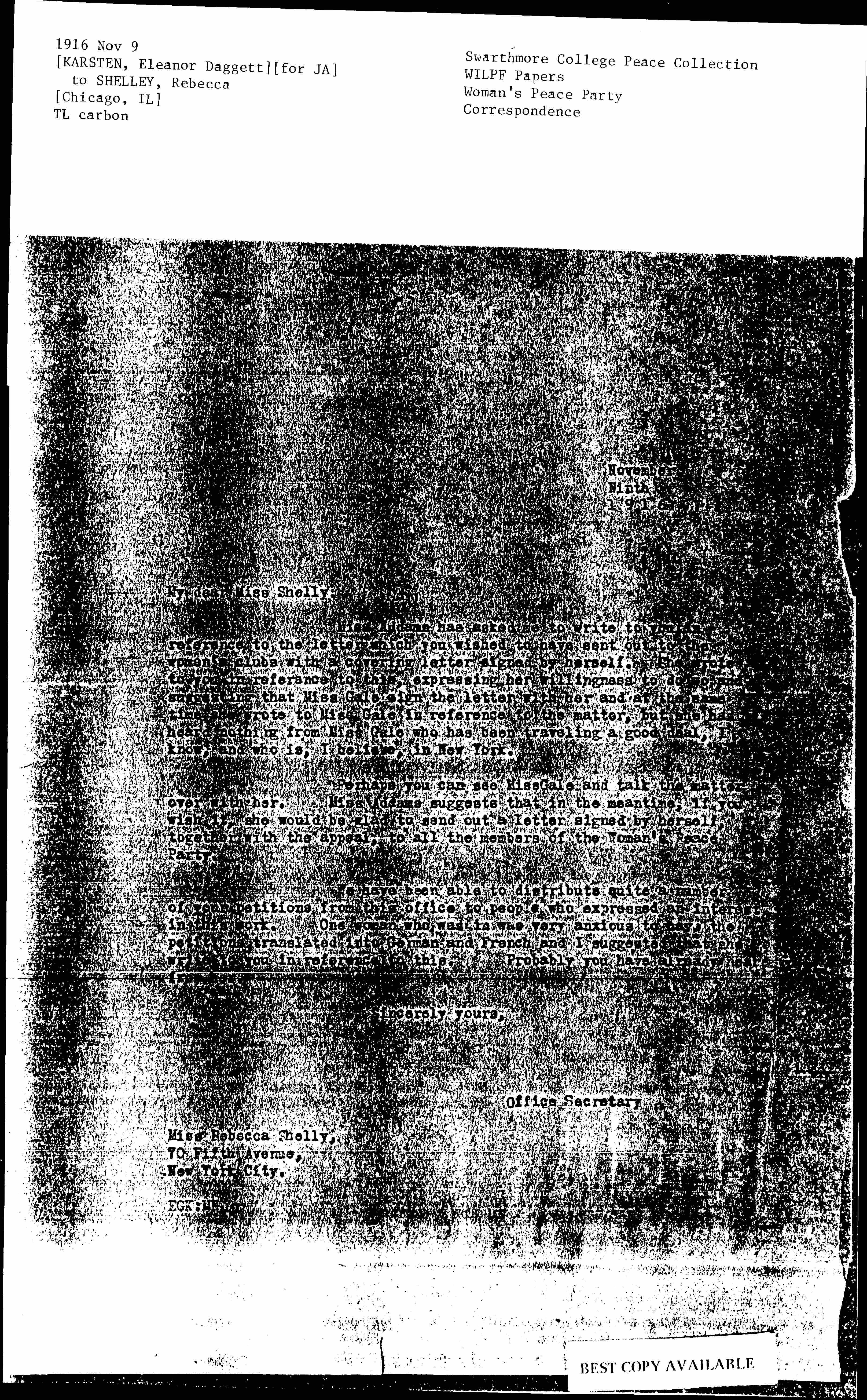 Perhaps you can see Miss Gale and talk the matter over with her. Miss Addams suggests that in the meantime, if you wish it, she would be glad to send out a letter signed by herself, together with the appeal, to all the members of the Woman's Peace Party.