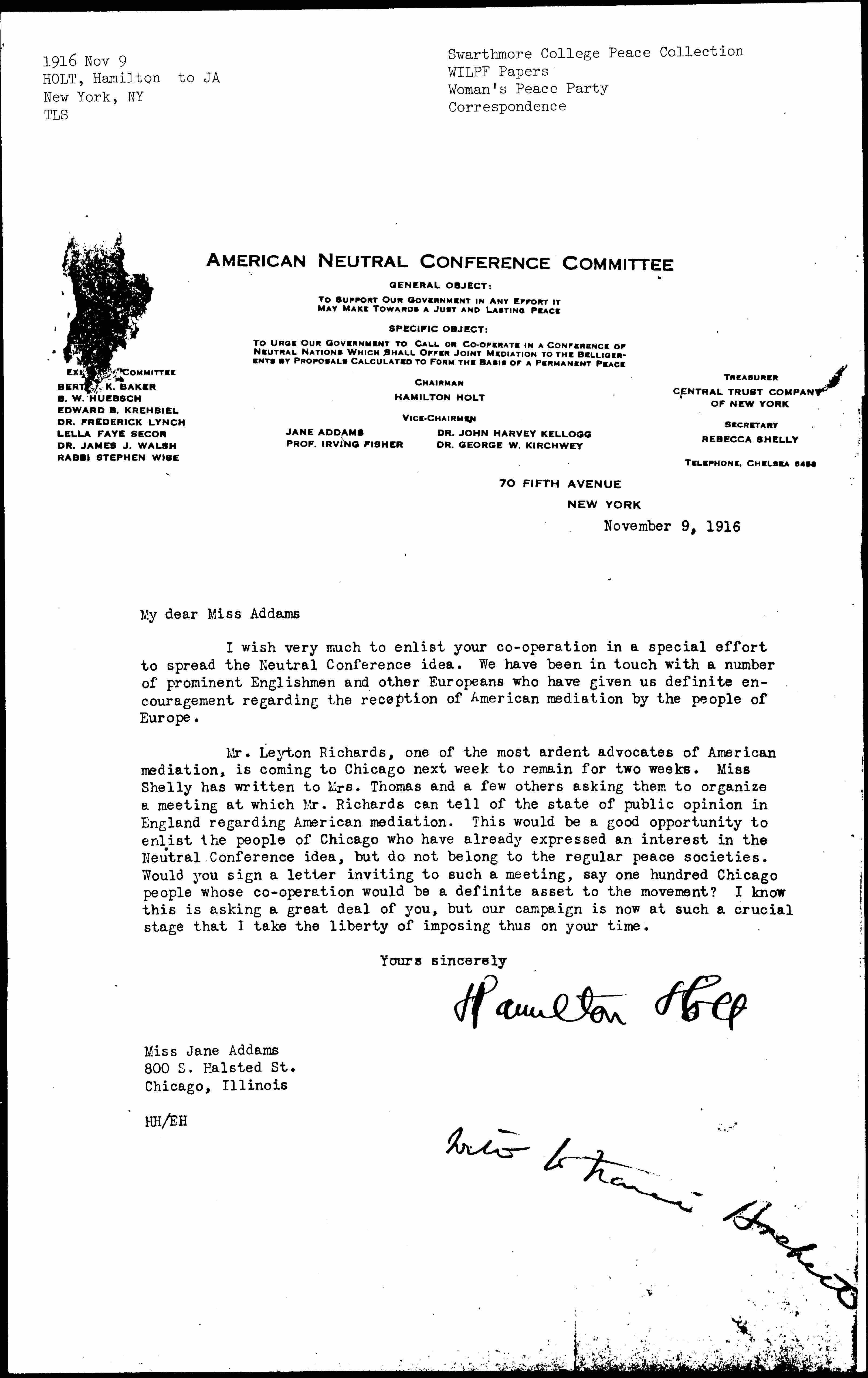 Mr. Leyton Richards, one of the most ardent advocates of American mediation, is coming to Chicago next week to remain for two weeks. Miss Shelly has written to Mrs. Thomas and a few others asking them to organize a meeting at which Mr. Richards can tell of the state of public opinion in England regarding American mediation. This would be a good opportunity to enlist the people of Chicago who have already expressed an interest in the Neutral Conference idea, but do not belong to the regular peace societies. Would you sign a letter inviting to such a meeting, say one hundred Chicago people whose [cooperation] would be a definite asset to the movement? I know this is asking a great deal of you, but our campaign is now at such a crucial stage that I take the liberty of imposing thus on your time.