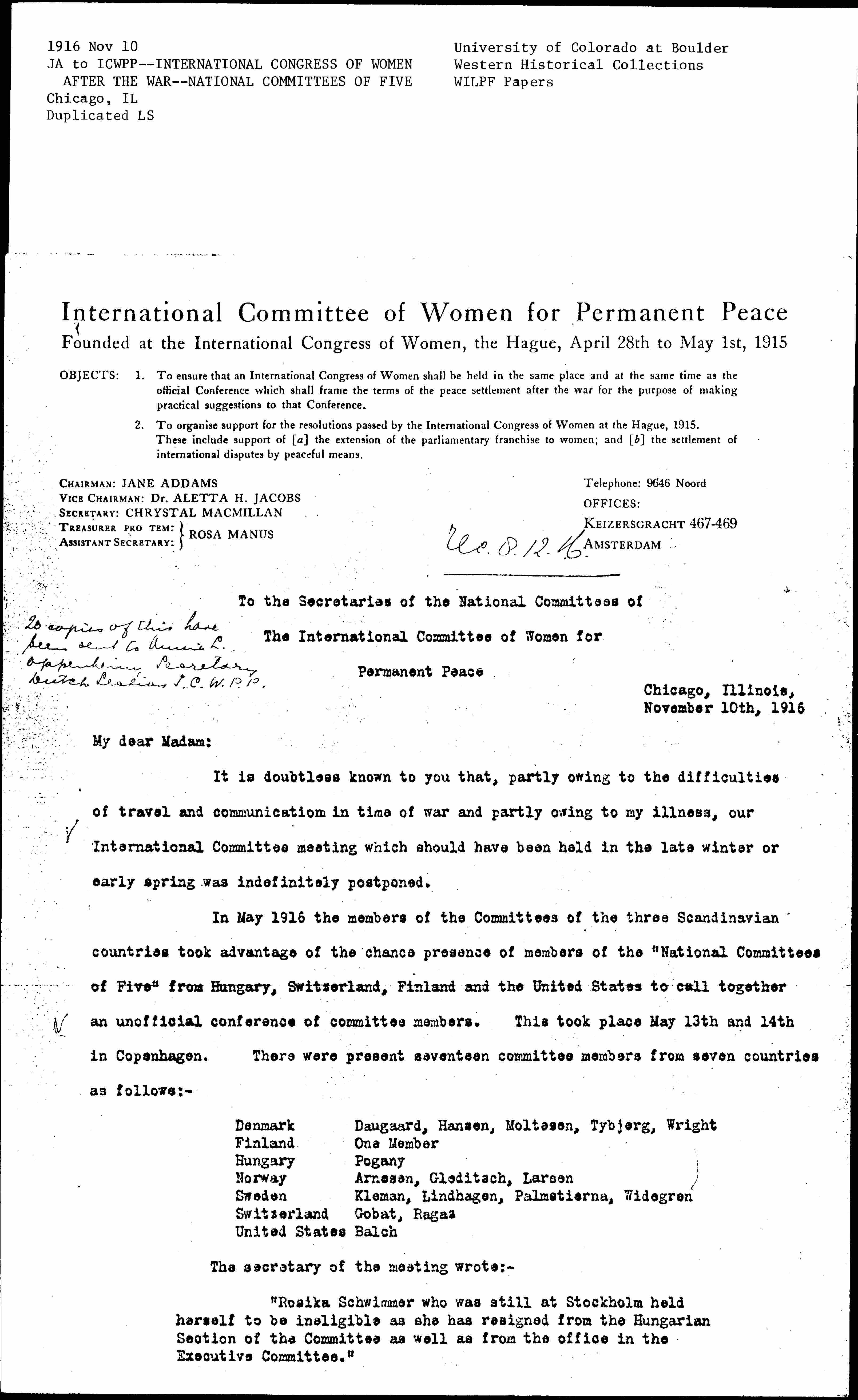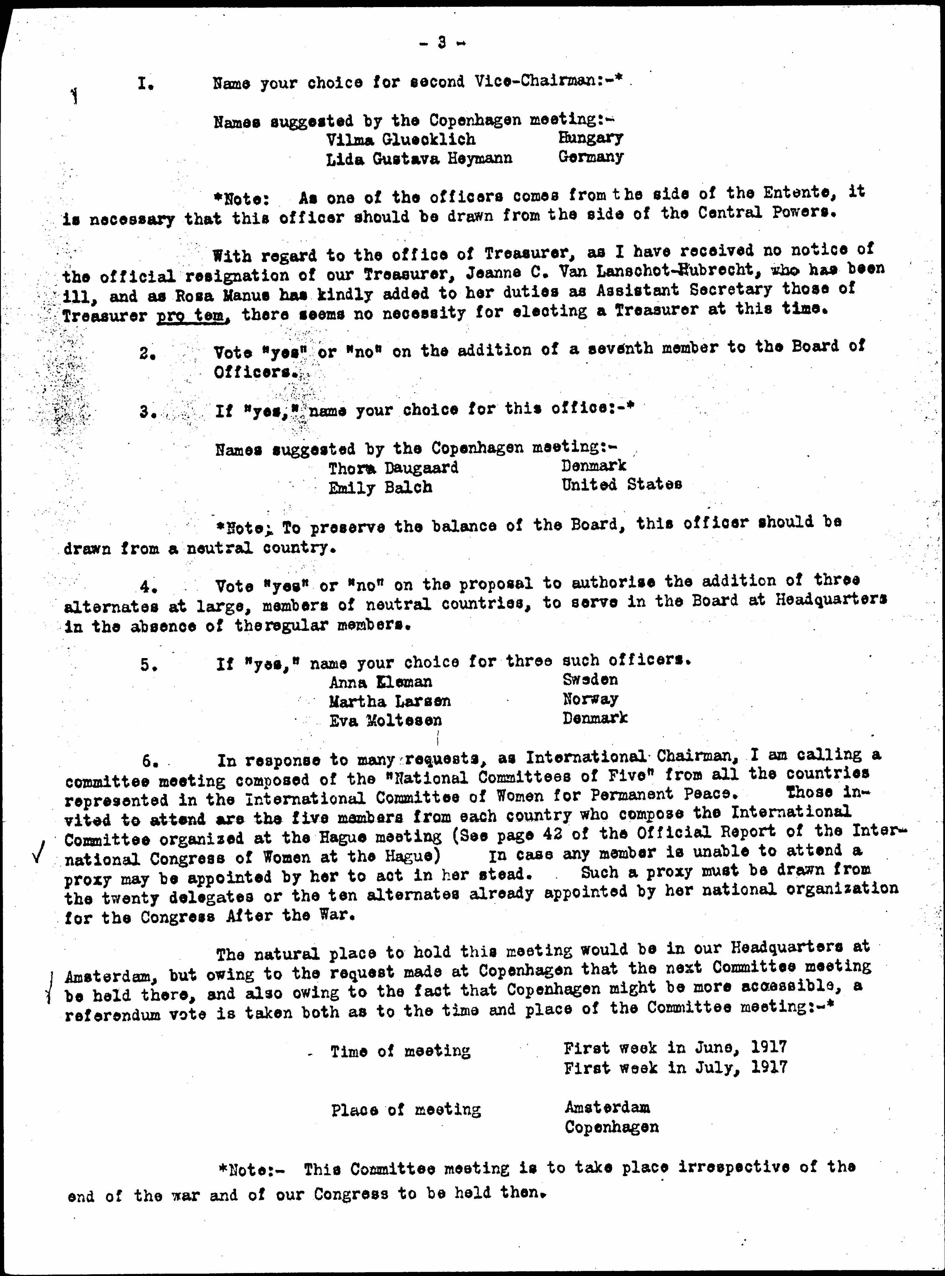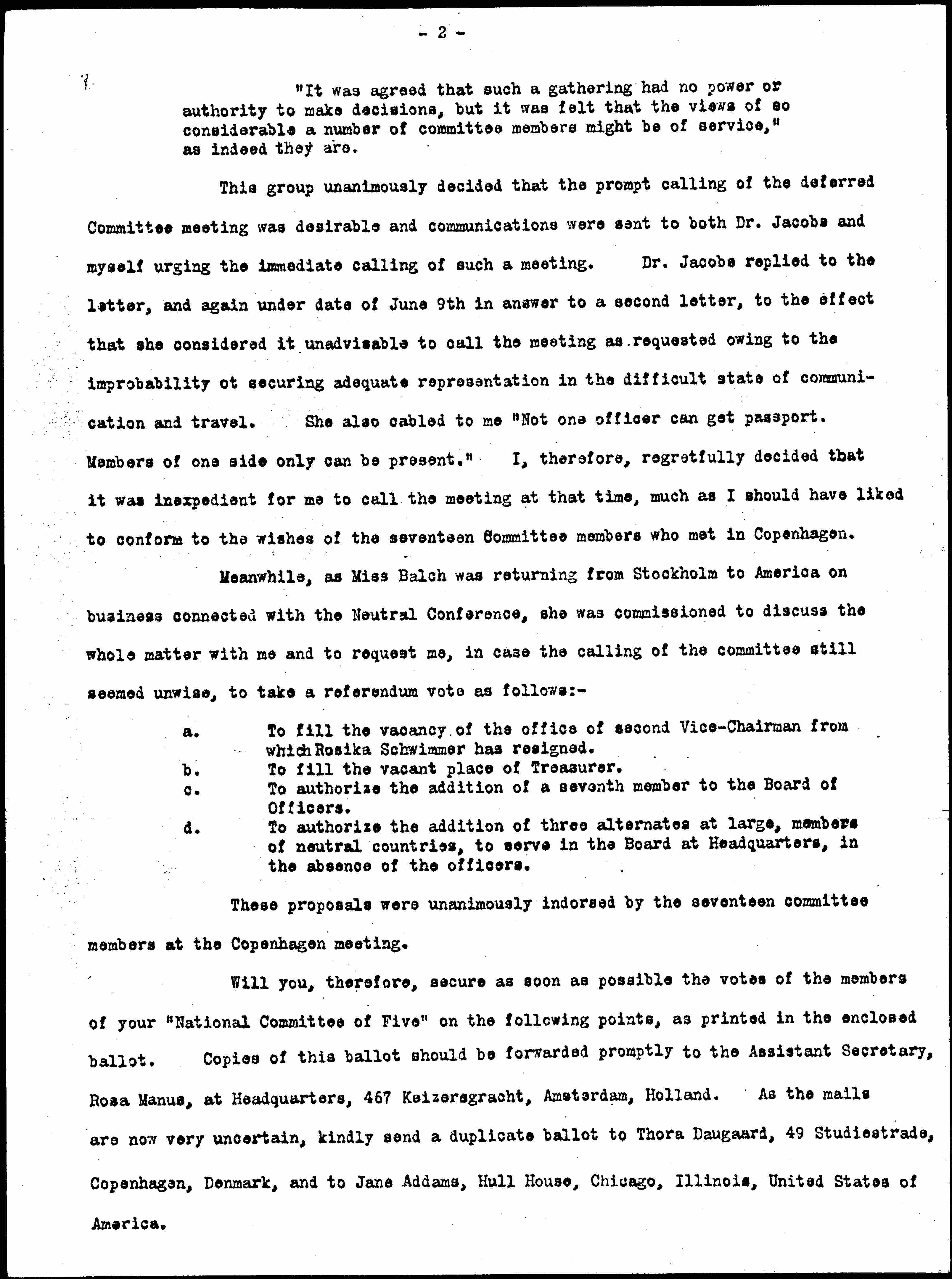 Will you, therefore, secure as soon as possible the votes of the members of your "National Committee of Five" on the following points, as printed in the enclosed ballot. Copies of this ballot should be forwarded promptly to the Assistant Secretary, Rosa Manus, at Headquarters, 467 Keizersgracht, Amsterdam, Holland. As the mails are now very uncertain, kindly send a duplicate ballot to Thora Daugaard, 49 [Studiestræde], Copenhagen, Denmark, and to Jane Addams, Hull House, Chicago, Illinois, United States of America. [page 3]