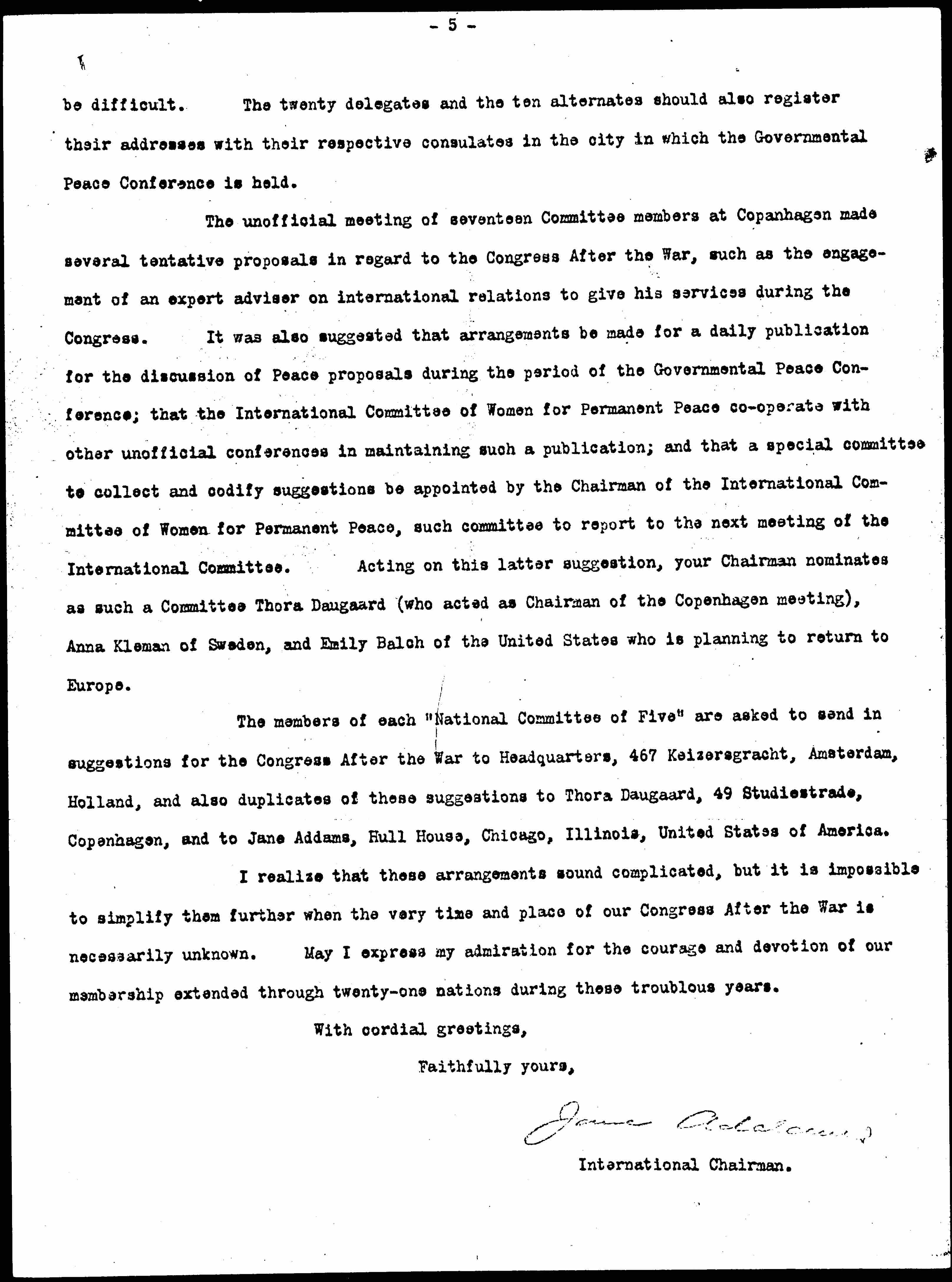 The members of each "National Committee of Five" are asked to send in suggestions for the Congress After the War to Headquarters, 467 Keizersgracht, Amsterdam, Holland, and also duplicates of these suggestions to Thora Daugaard, 49 [Studiestræde], Copenhagen, and to Jane Addams, Hull House, Chicago, Illinois, United States of America.