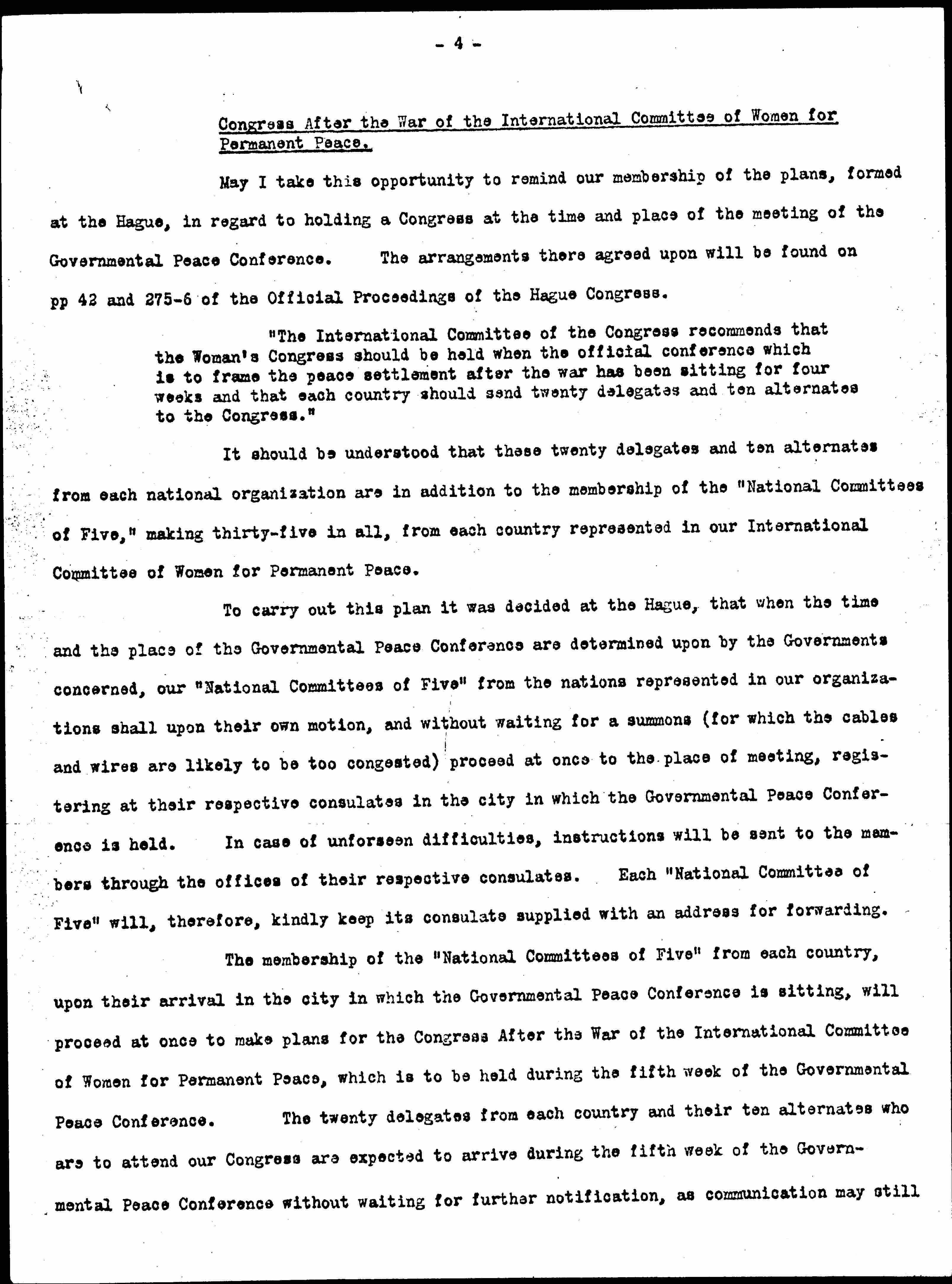 The membership of the "National Committees of Five" from each country, upon their arrival in the city in which the Governmental Peace Conference is sitting, will proceed at once to make plans for the Congress After the War of the International Committee of Women for Permanent Peace, which is to be held during the fifth week of the Governmental Peace Conference. The twenty delegates from each country and their ten alternates who are to attend our Congress are expected to arrive during the fifth week of the Governmental Peace Conference without waiting for further notification, as communication may still [page 5] be difficult. The twenty delegates and the ten alternates should also register their addresses with their respective consulates in the city in which the Governmental Peace Conference is held.