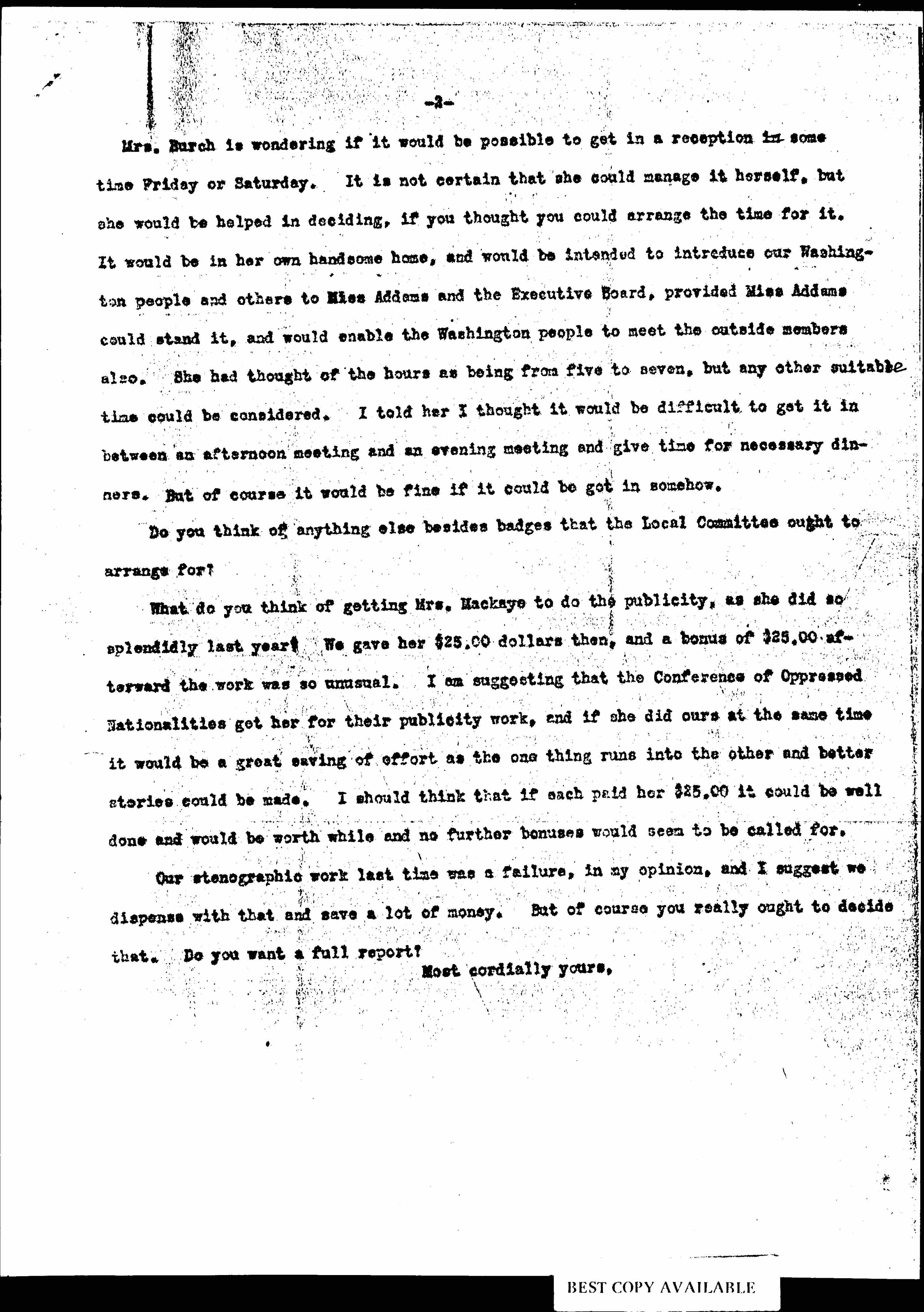 Mrs. Burch is wondering if it would be possible to get in a reception in some time Friday or Saturday. It is not certain that she could manage it herself, but she would be helped in deciding, if you thought you could arrange the time for it. It would be in her own handsome home, and would be intended to introduce our Washington people and others to Miss Addams and the Executive Board, provided Miss Addams could stand it, and would enable the Washington people to meet the outside members also. She had thought of the hours as being from five to seven, but any other suitable time could be considered. I told her I thought it would be difficult to get it in between an afternoon meeting and an evening meeting and give time for necessary dinners. But of course it would be fine if it could be got in somehow.