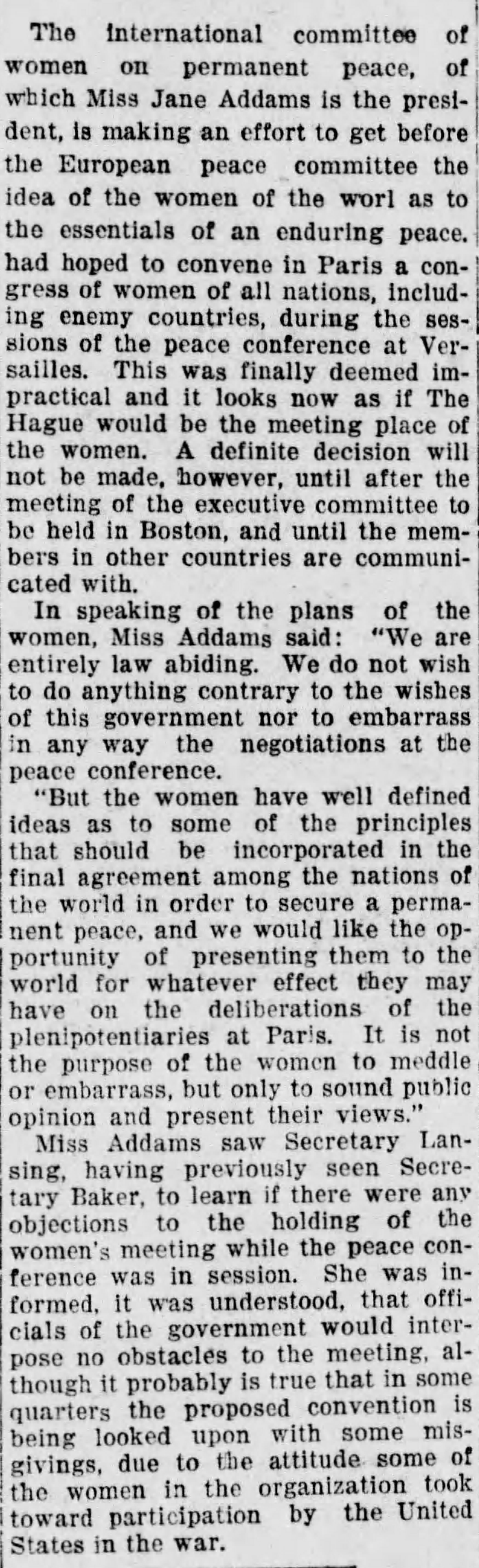 The international committee of women on permanent peace, of which Miss Jane Addams is the president, is making an effort to get before the European peace committee the idea of the women of the [world] as to the essentials of an enduring peace, had hoped to convene in Paris a congress of women of all nations, including enemy countries, during the sessions of the peace conference at Versailles. This was finally deemed impractical and it looks now as if The Hague would be the meeting place of the women. A definite decision will not be made, however, until after the meeting of the executive committee to be held in Boston, and until the members in other countries are communicated with.