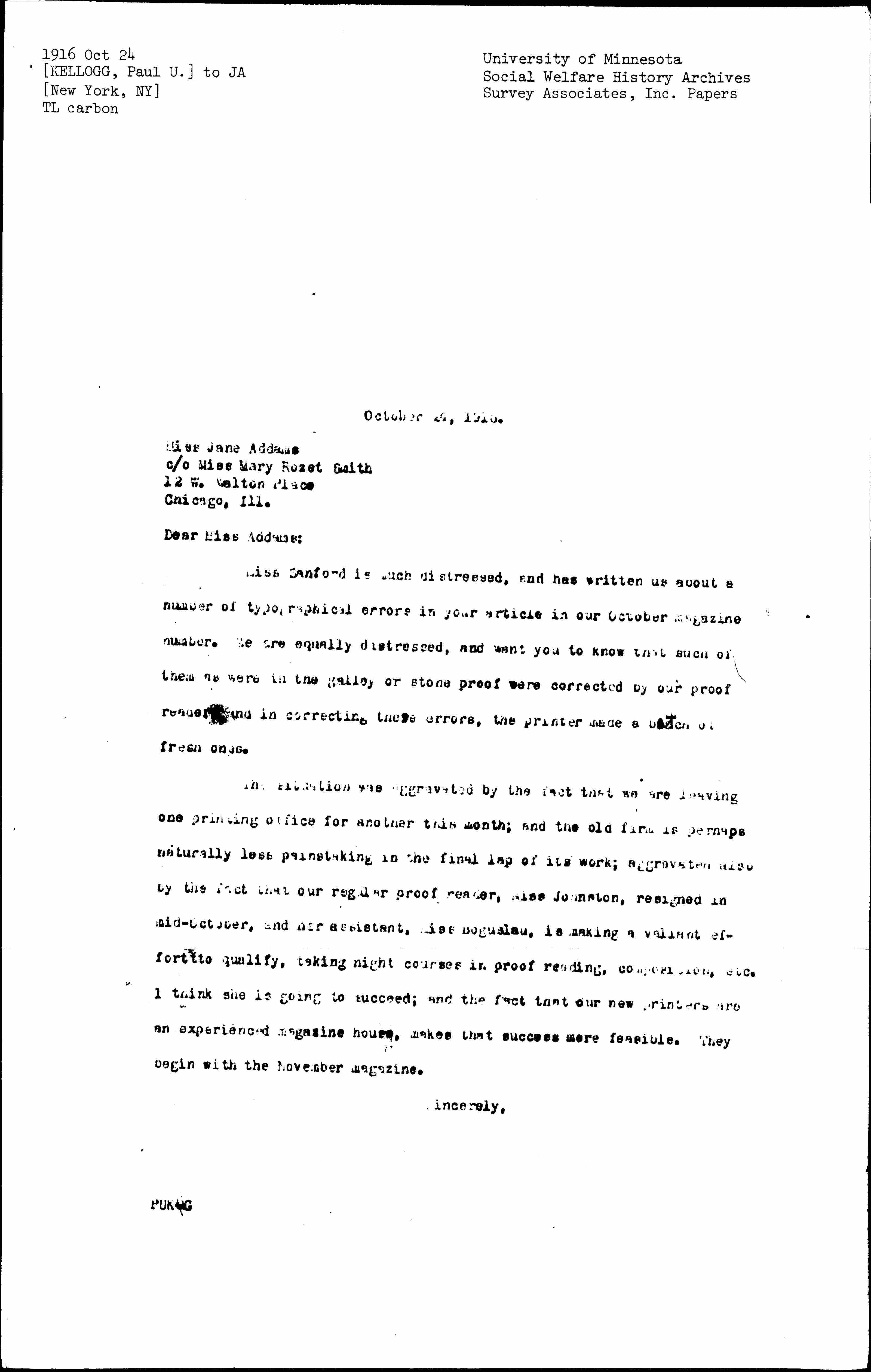 Miss Sanford is much distressed, and has written us about a number of typographical errors in your article in our October magazine number. We are equally distressed, and want you to know that such of them as were in the galley or stone proof were corrected by our proof [reader] and in correcting these errors, the printer made a batch of fresh ones.