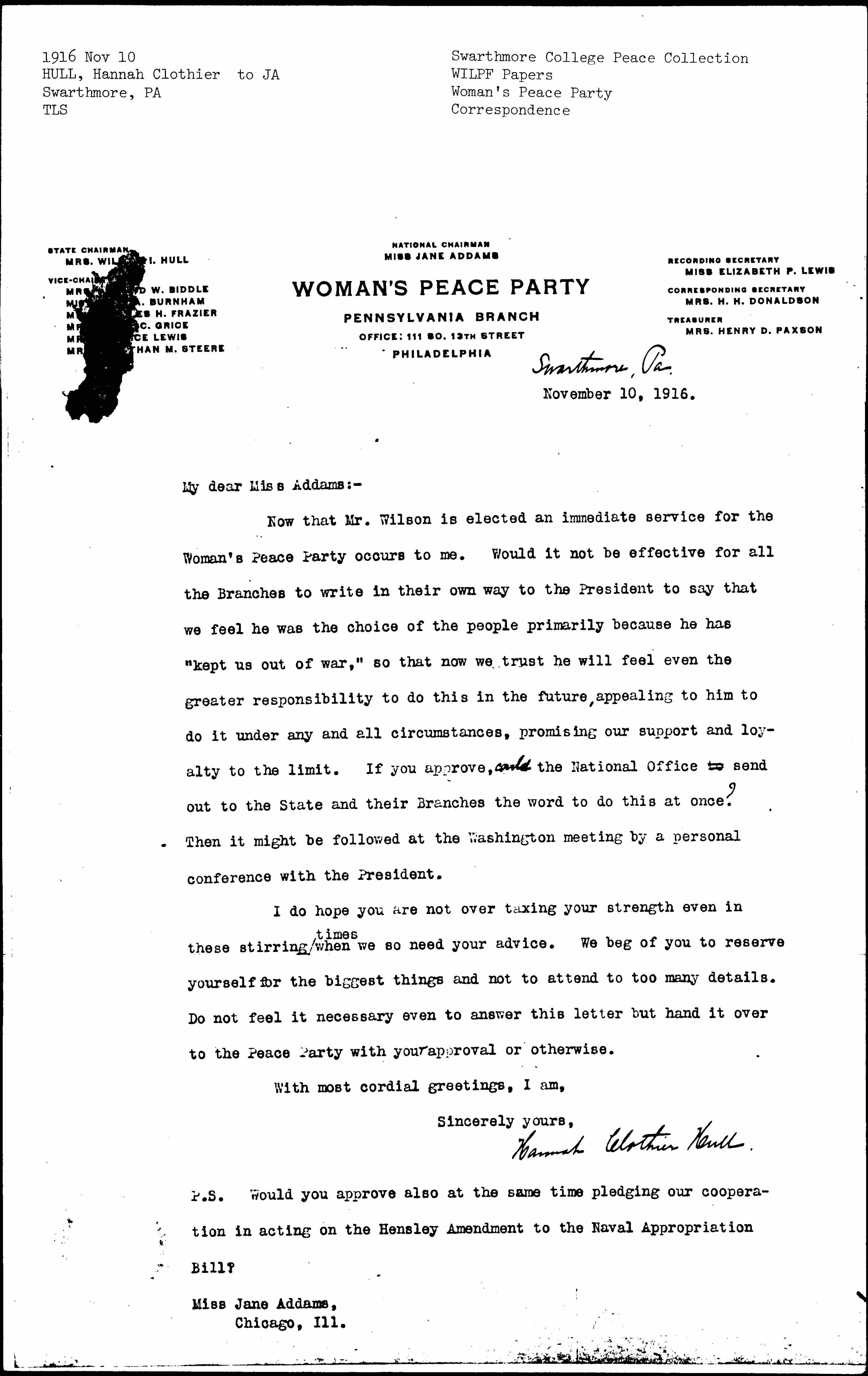 Now that Mr. Wilson is elected an immediate service for the Woman's Peace Party occurs to me. Would it not be effective for all the Branches to write in their own way to the President to say that we feel he was the choice of the people primarily because he has "kept us out of war," so that now we trust he will feel even the greater responsibility to do this in the future, appealing to him to do it under any and all circumstances, promising our support and loyalty to the limit. If you approve, <could> the National Office to send out to the State and their Branches the word to do this at once? Then it might be followed at the Washington meeting by a personal conference with the President.